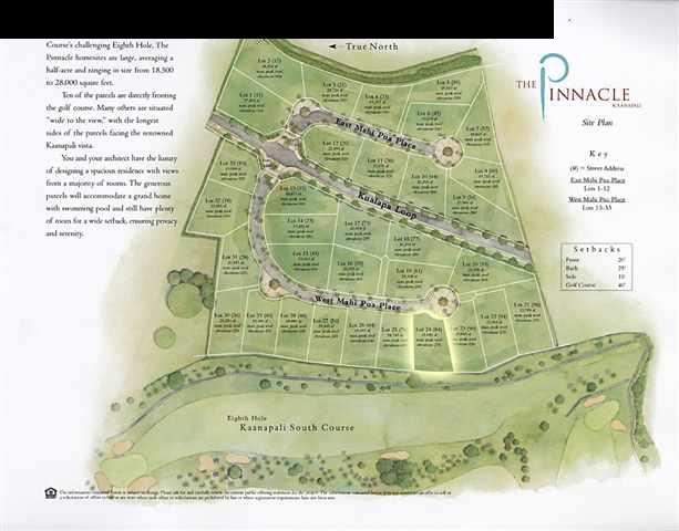Fanastic opportunity to build your dream home in the exclusive Pinnacle neighborhood! 18,977 square feet located directly on the 8th Fairway of the Kaanapali Kai Golf Course. One of only two homesites left remaining. Offering sunset views into the Pacific Ocean framed by the islands of Lanai and Molokai. The Pinnacle offers easy access to the sunny beaches, five-star hotels, lush golf courses and wonderous amenities of world-renowned Kaanapali Resort, The Pinnacle presents the way of life you've been dreaming of. Atop the lush hillside known as the Kaanapali Golf Estates, The Pinnacle's 33 estate-sized custom home sites are the essence of a luxury Maui lifestyle and the finest residential living in the Pacific.