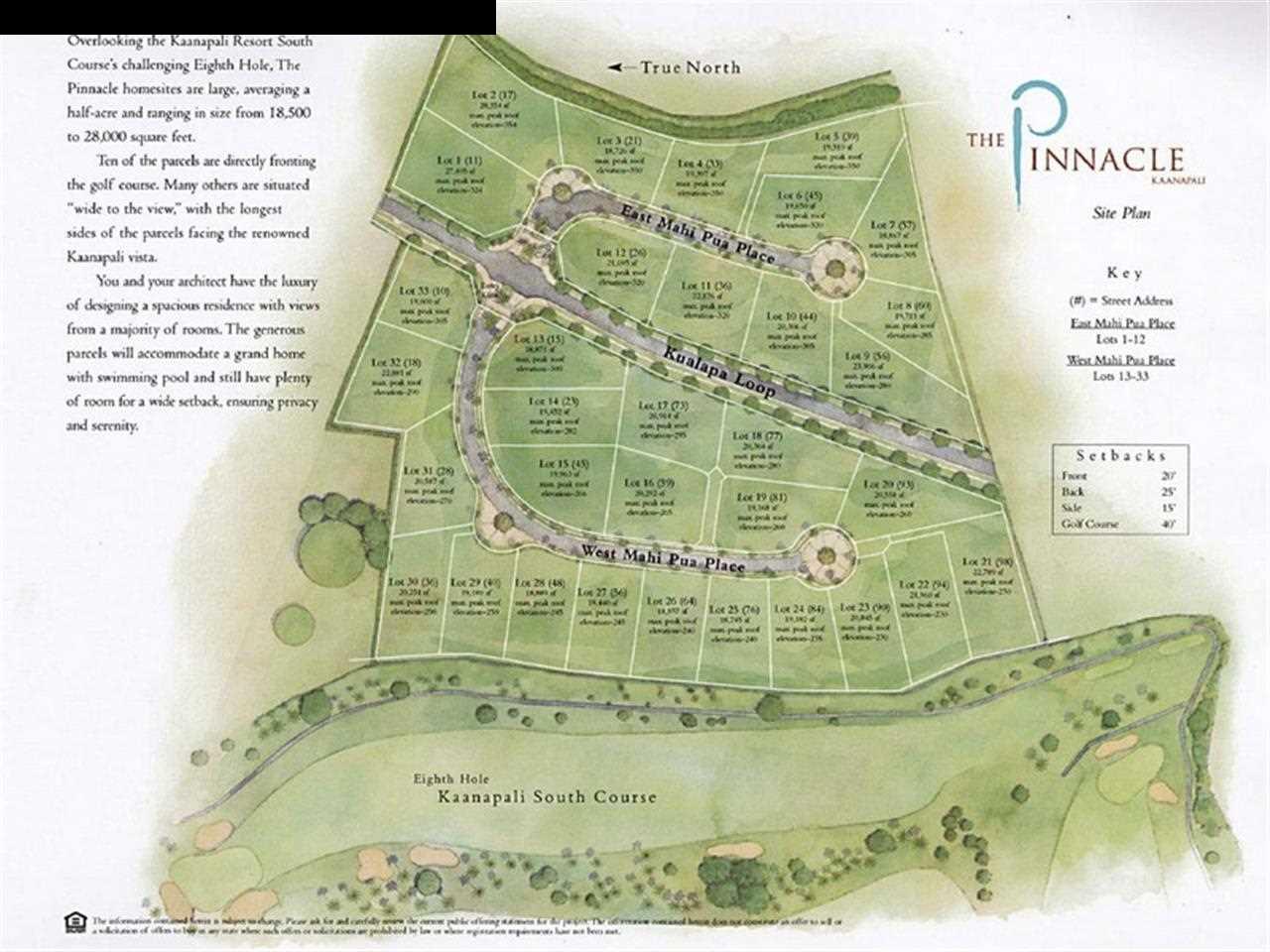 The finest building site in Kaanapali, 73 West Mahi Pua was the highest-valued parcel among the original thirty-three developer offerings in the Pinnacle. It has a level building area, which should demand far less site preparation than other lots, and commands a truly unobstructable 180-degree ocean view. The Pinnacle is a gated, exclusive and established neighborhood with over two-thirds of the lots complete with beautiful custom homes. The Kaanapali Golf Estates is famous for consistently beautiful weather, proximity to great beaches, dining and action day and night, and The Pinnacle is the top sub-division within the Golf Estates. If you are looking for the ideal spot for your dream home, in the finest enclave in Kaanapalihere it is.