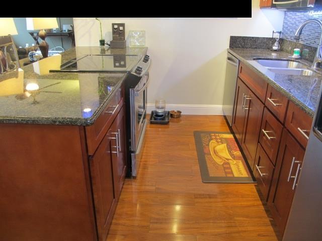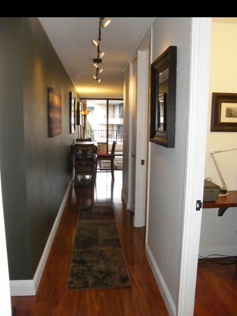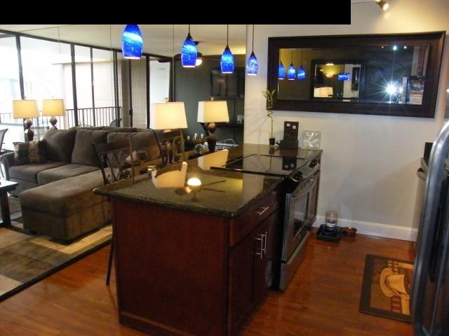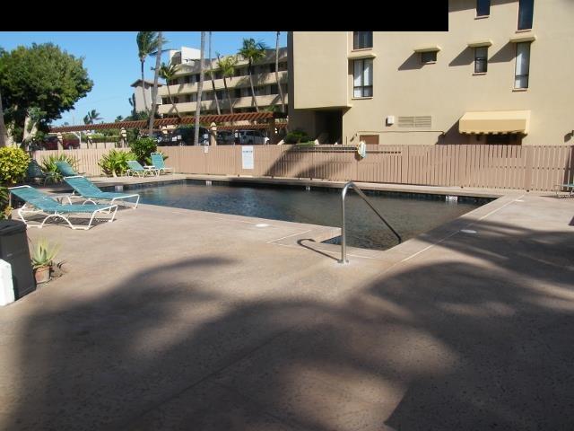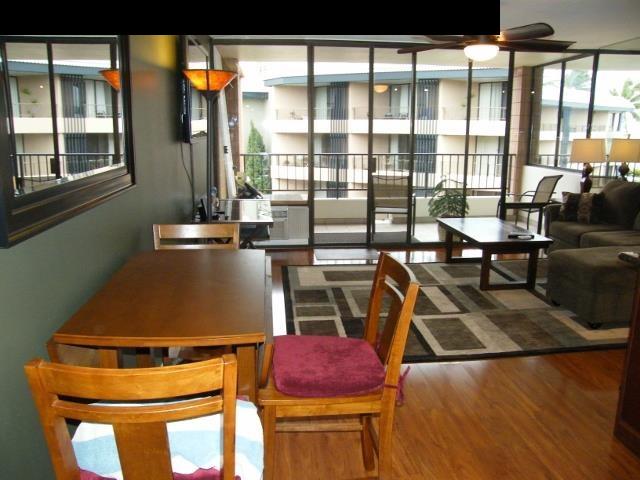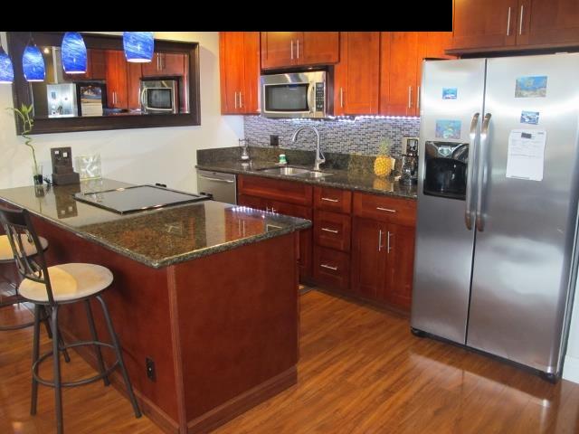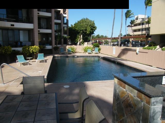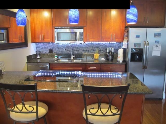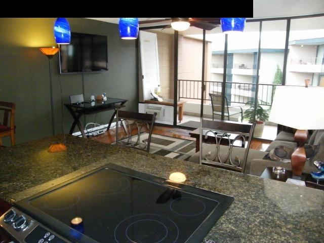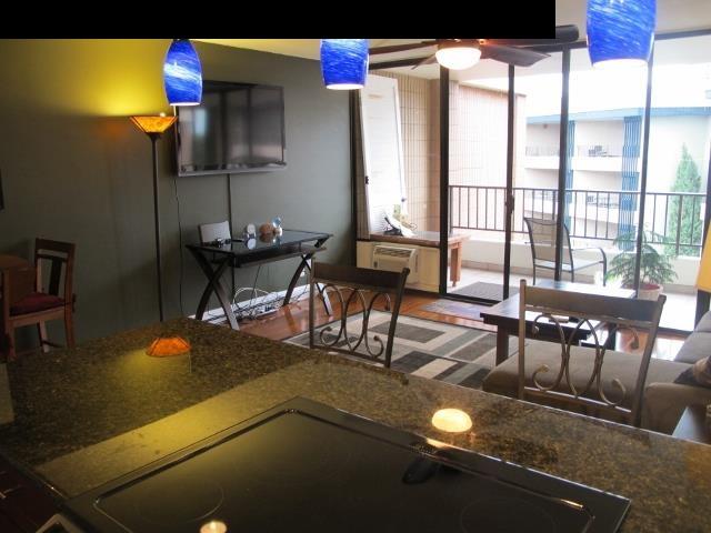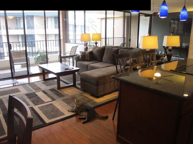 Large nicely renovated (2014), centrally located, 1B/1B condo in ocean front complex that allows vacation rentals. Partial Ocean view from living room and Lanai. Beautiful mountain view from bedroom. Top floor and corner unit which is very quiet without hallway foot traffic. All new Stainless steel appliances, new cost efficient hot water heater, new remote controlled ceiling fans, and new remote controlled air conditioner. Hardwood floors throughout, new, plush carpet with upgraded padding in bedroom. Bedroom has 2 mirrored closets. Beautiful Granite counter tops and new cabinets and hardware in kitchen. Under and over cabinet led lighting. Led lighting and Led track lighting throughout which reduces the electric bill. Small Office/Craft room with built-in, custom desk and electric outlet which could be easily converted back to a large Owner's Closet. Cable TV in Living room and two outlets in bedroom and office. New Bathroom vanity with Quartz counter top, bronze fixtures and faucets. Must see to appreciate! Property offers ocean front pool, secured elevator, laundry room in every floor and exterior storage space available as well.