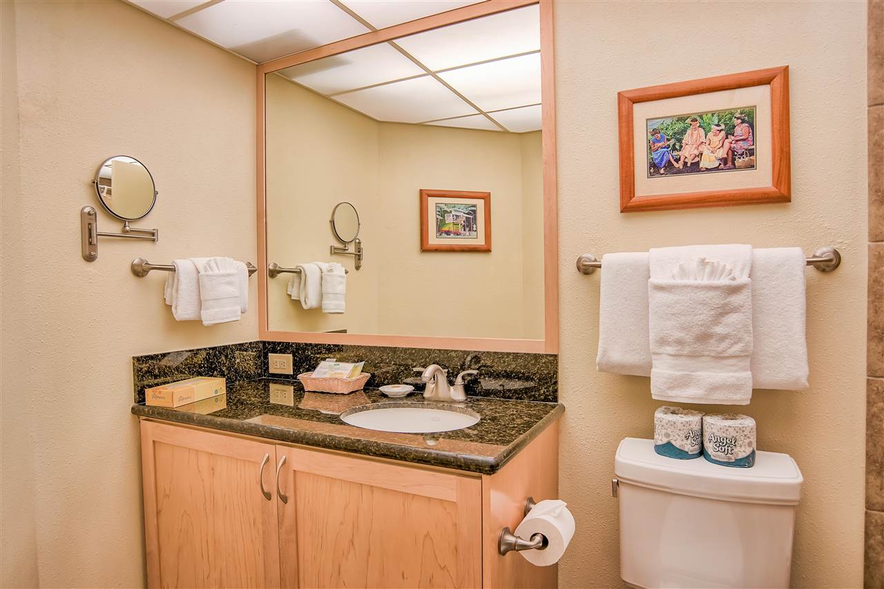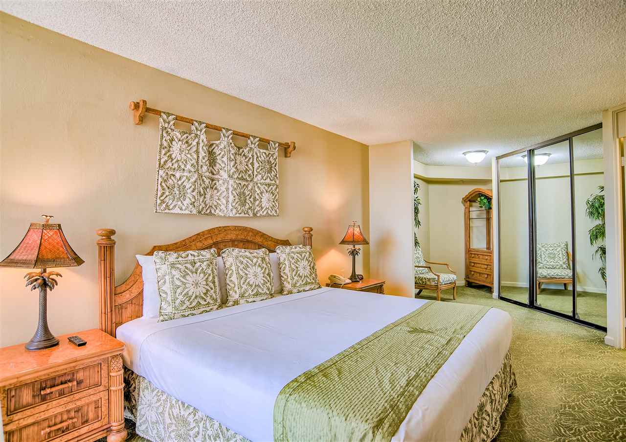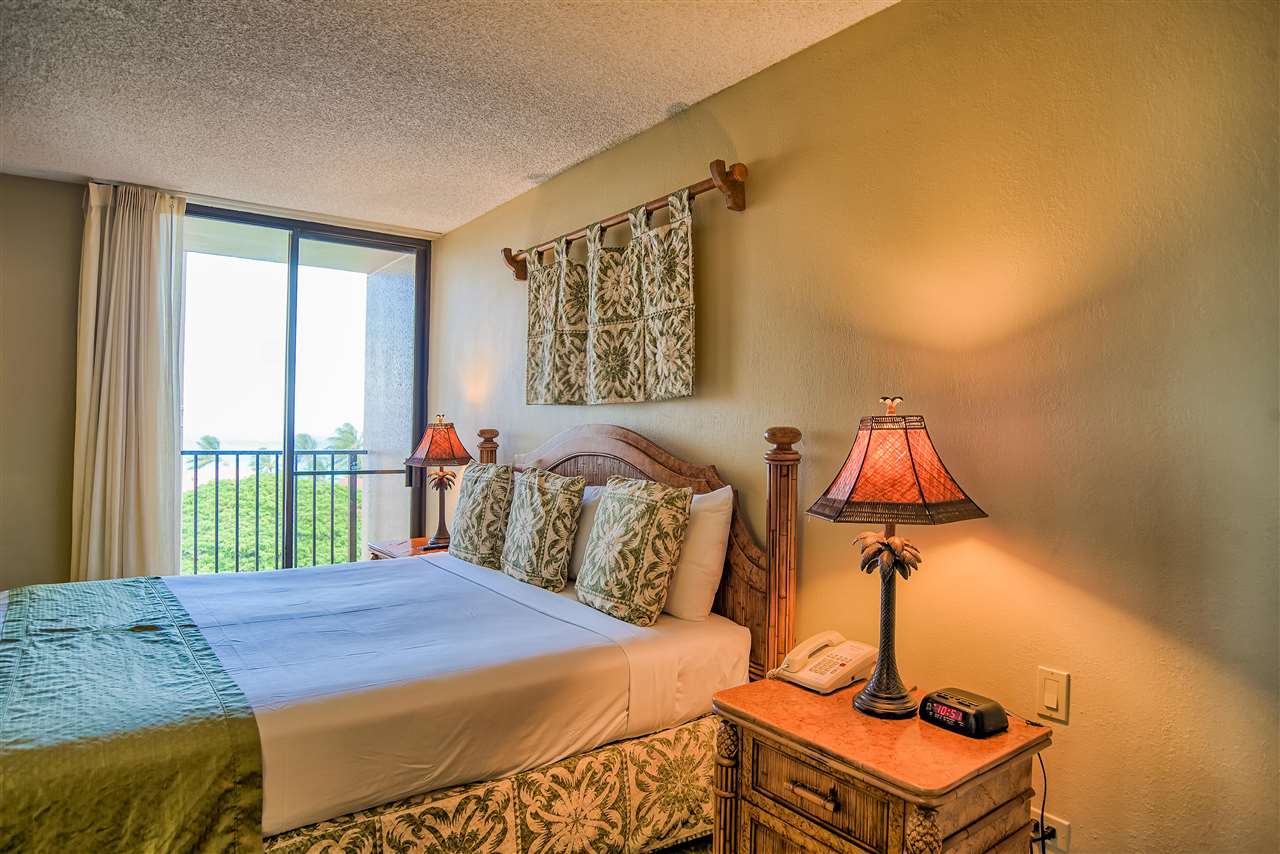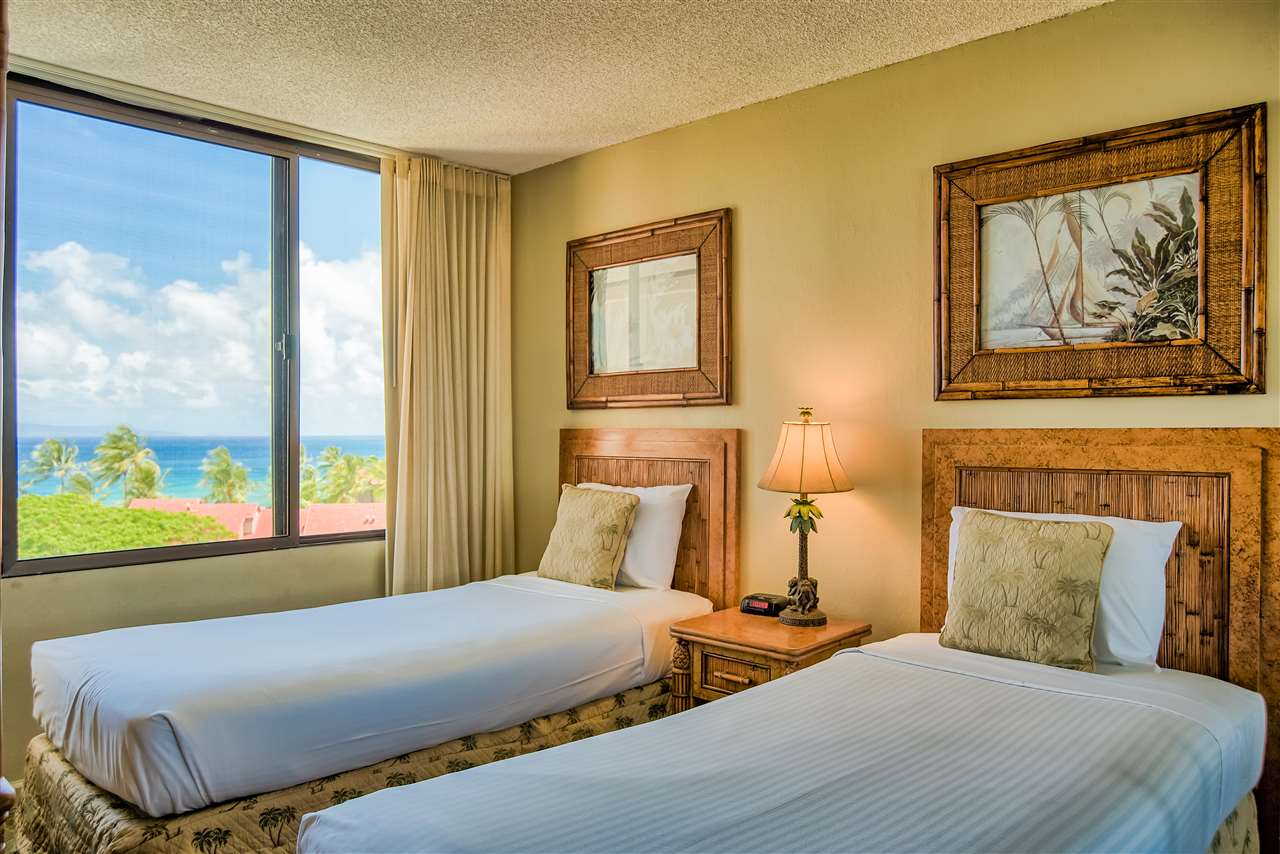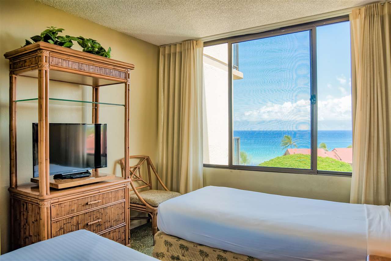 The sweeping ocean views from the quiet side of Kaanapali Shores are perhaps the first thing to grab your attention as you step into this stunning 2 bedroom 8th floor condominium. And thats just the beginning. Kaanapali Shores 816 actually has not one, but three ocean views. You can lounge on the living room lanai and watch whales in the winter. The view takes in the length of Molokai and stretches along Mauis west side shoreline to the treetops at Kapalua. The guest room has 2 twin beds and a window almost as wide as the room. You can lay in bed and look out at the ocean. The master suite is huge. There is a king size bed with plenty of room for a comfortable reading area. It also has a unique little, very private, lanai that offers those same stunning views, but from the privacy of your suite. The owners lovingly renovated this beautiful hideaway just a few short years ago. The kitchen has all newer appliances, custom made cabinets and dark granite with a black background and flecks of chocolate coloring that create a striking contrast to the light cabinets.