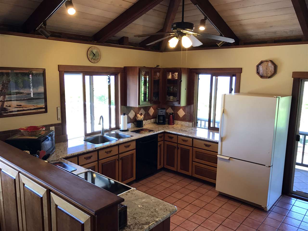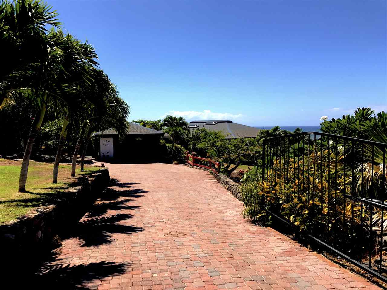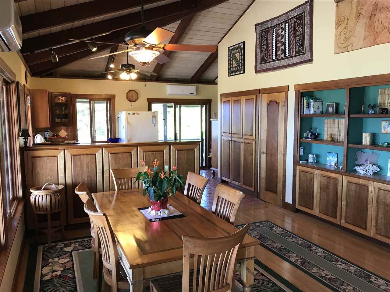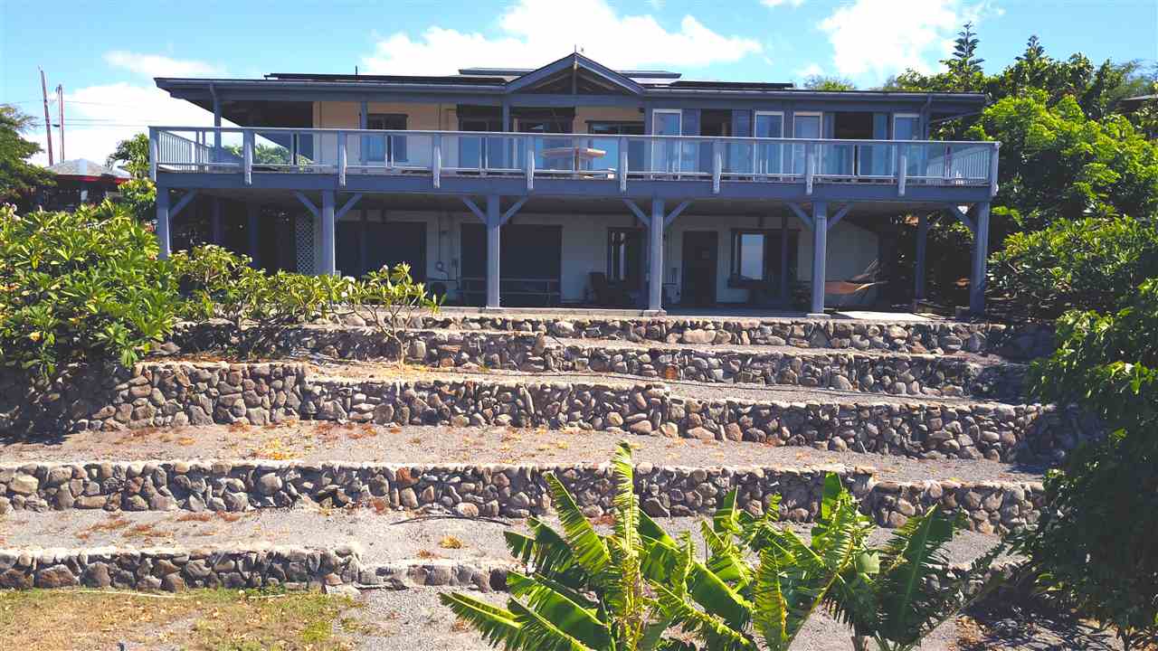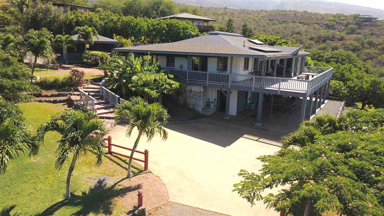 The front row location of this property allows you a panoramic view of the ocean from sunrise to sunset. Custom throughout with beautiful wood finishes.There is so much that sets this property apart from others. Solar air conditioning and hot water, high beam ceilings and wrap around covered decks. Gorgeous stonework and pathways take you along to various additions of the property such as the custom Gazebo, stone shower, orchid garden house, work shed and upper carport. Gated paved driveway takes you along the manicured irrigated fenced yard. Well groomed and maintained with mature fruit trees. On the lower level there is a large two car garage complete with it's own covered patio, attached living room, bed and bath room and kitchenette. Perfect for extended family or visiting guests.