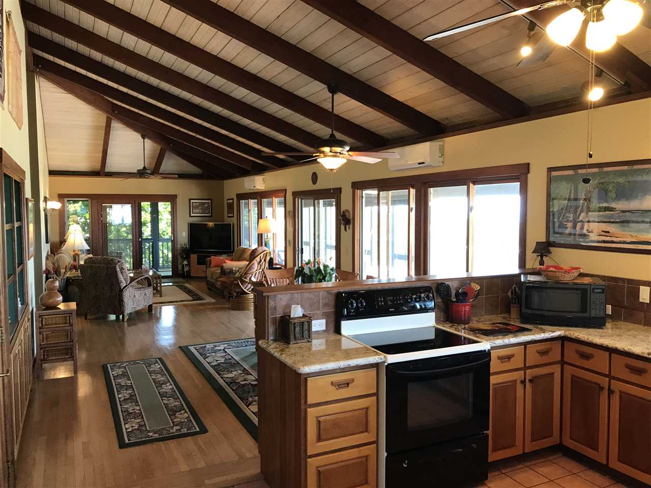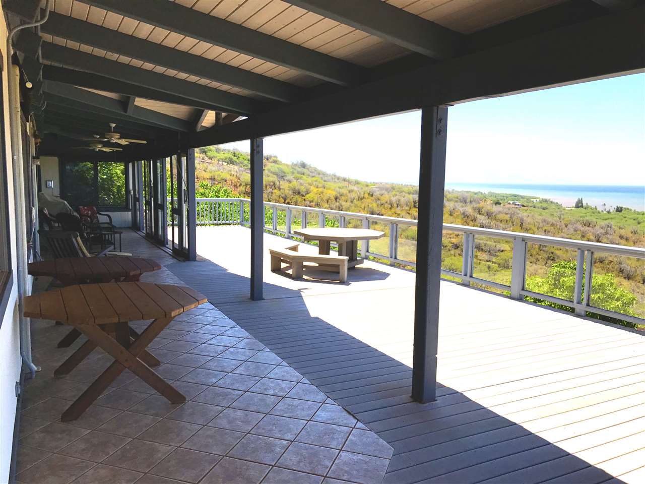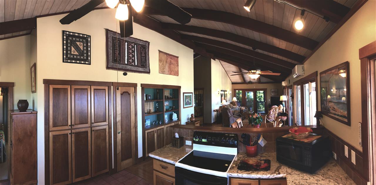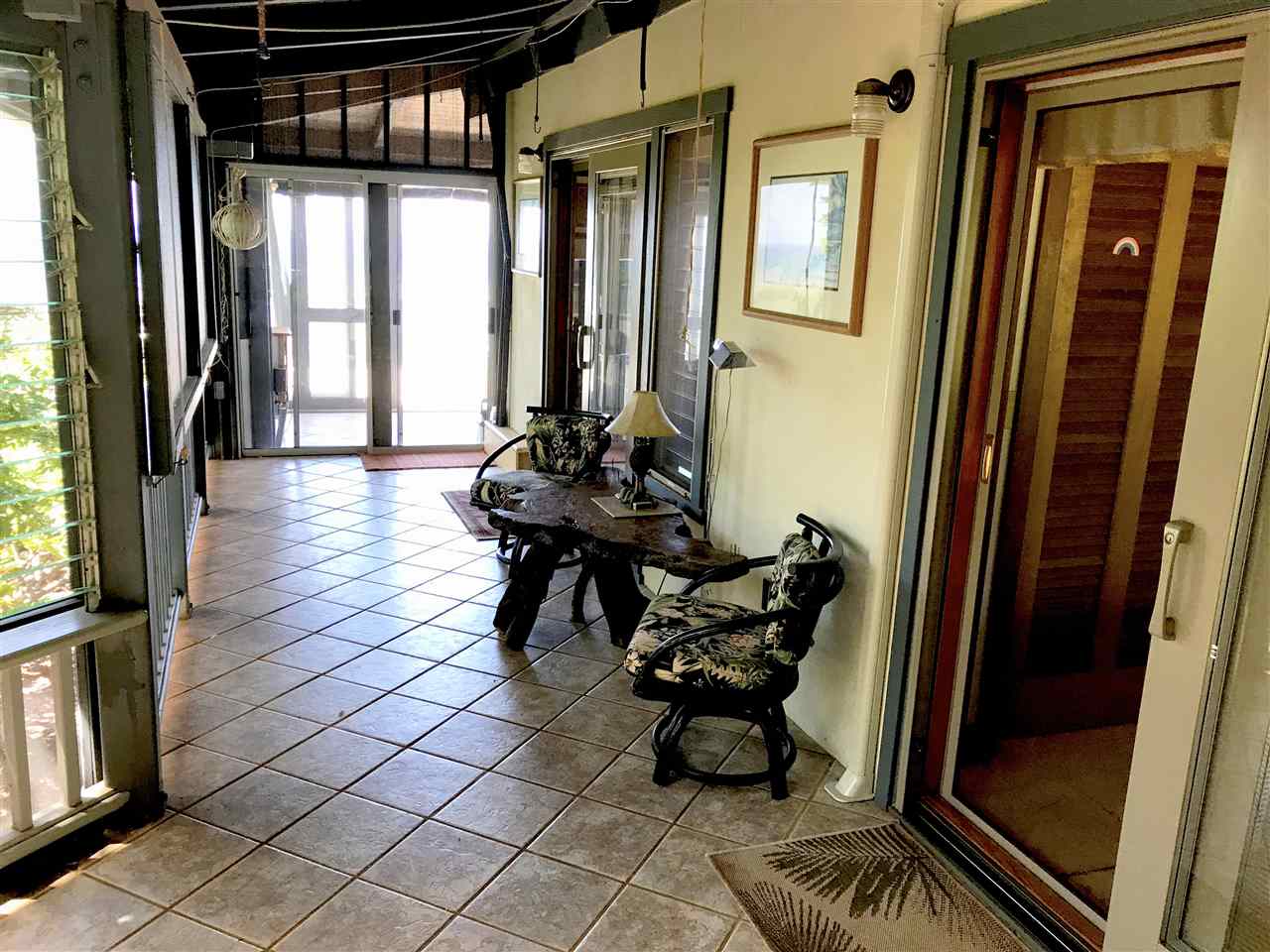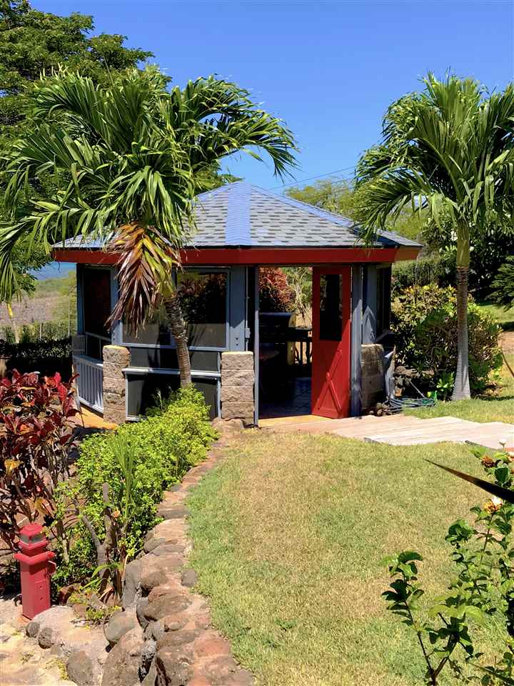 The front row location of this property allows you a panoramic view of the ocean from sunrise to sunset. Custom throughout with beautiful wood finishes.There is so much that sets this property apart from others. Solar air conditioning and hot water, high beam ceilings and wrap around covered decks. Gorgeous stonework and pathways take you along to various additions of the property such as the custom Gazebo, stone shower, orchid garden house, work shed and upper carport. Gated paved driveway takes you along the manicured irrigated fenced yard. Well groomed and maintained with mature fruit trees. On the lower level there is a large two car garage complete with it's own covered patio, attached living room, bed and bath room and kitchenette. Perfect for extended family or visiting guests.