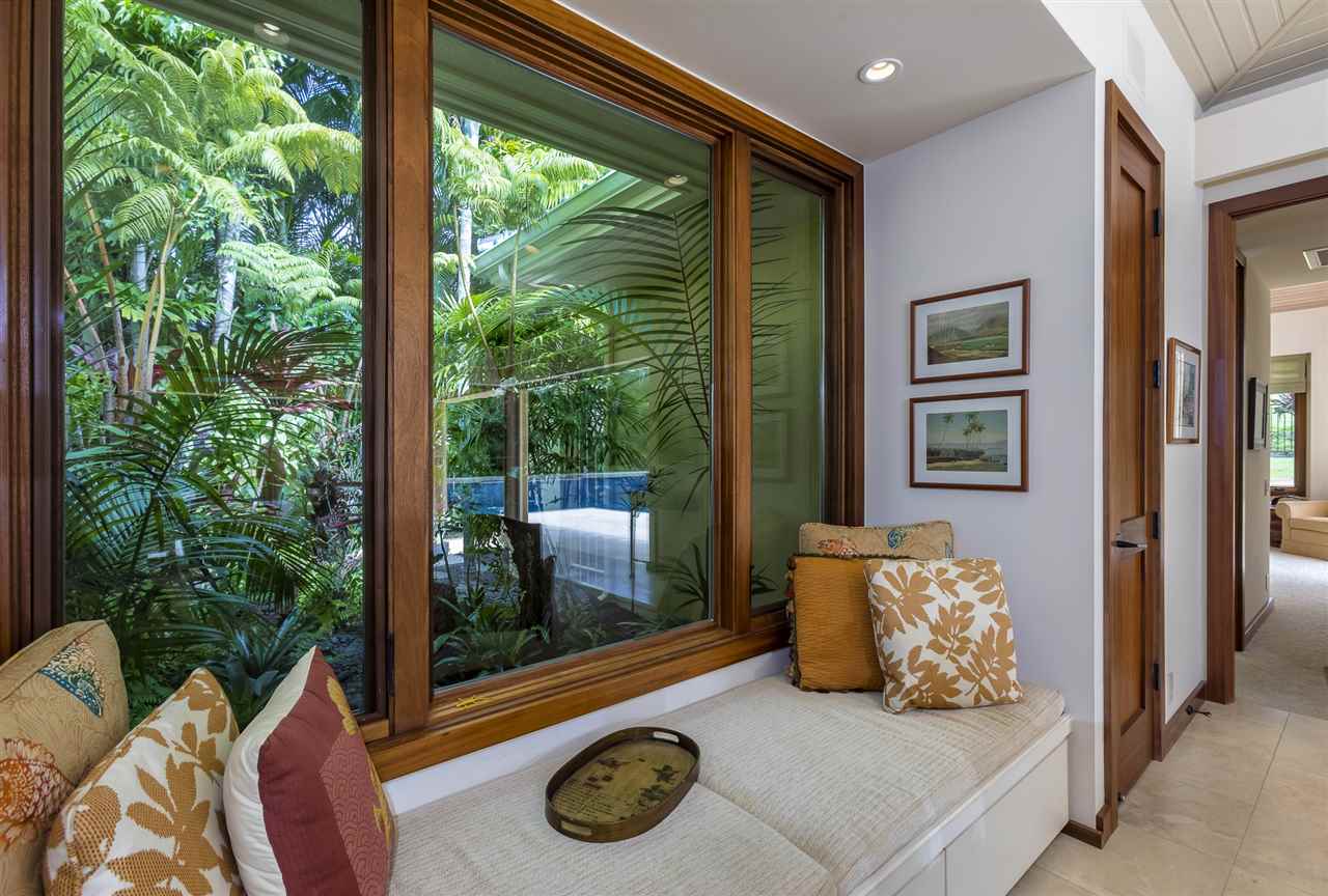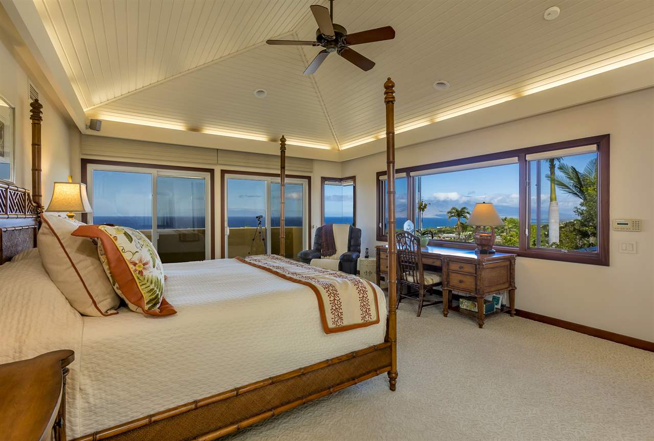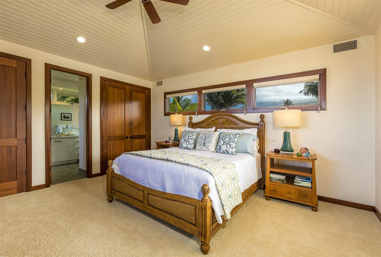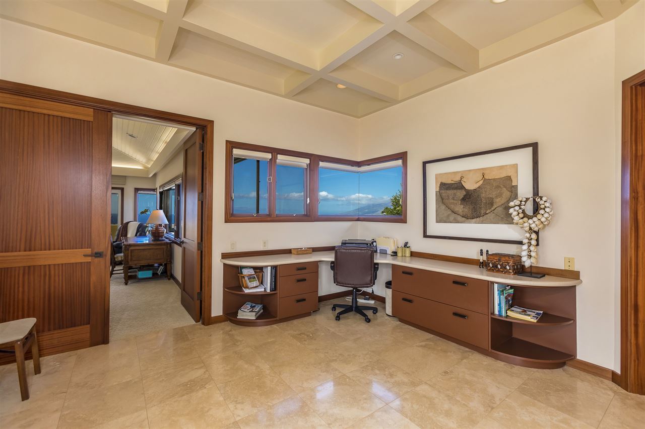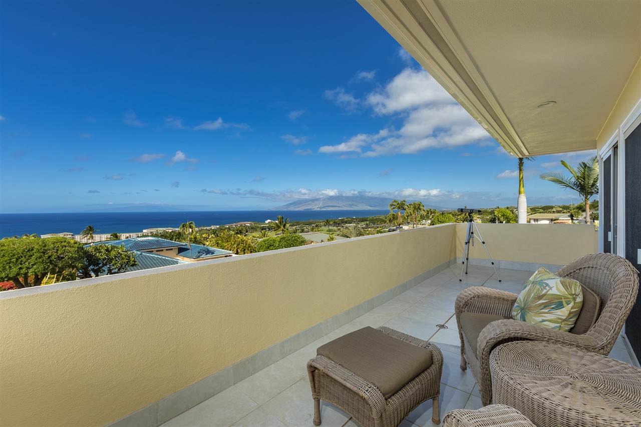 Lift your eyes to the Mountains! Look to the east from the open family room and see the sun rise over Haleakala and fill your beautiful kitchen with morning sun. Look to the west from the upstairs Master Bedroom lanai to the majestic West Maui Mountains as the sun sets over the Pacific. So many living areas in this home to be alone or together. Two bedrooms (each with an ensuite bath) and open office area upstairs with separate lanais, one with Haleakala view and one with ocean views. Lovely living room for reading or watching TV and another bedroom with ensuite bath downstairs if anyone has trouble with stairs. Elevator might be possible. But where you end up living is in the kitchen, family room – so warm and welcoming with its window seat. The heated pool is beautifully designed as it is protected from the tradewinds by the bedroom wing. This home designed by Tim Farrington, is on the mauka side of Wailea Ekolu Place and has the beautiful Wailea Blue Golf Course as its backyard. It is elegantly and tastefully furnished. Move in and start living in wonderful Wailea!