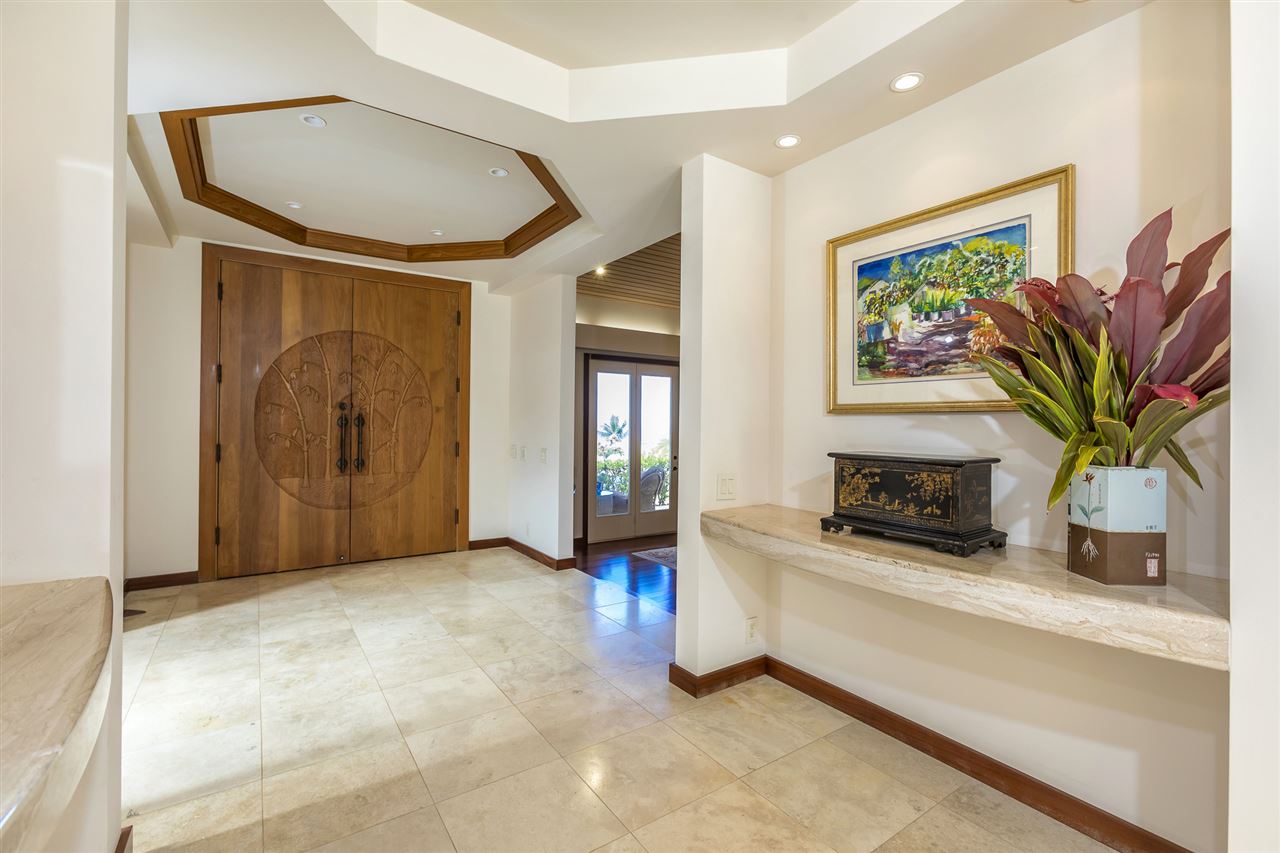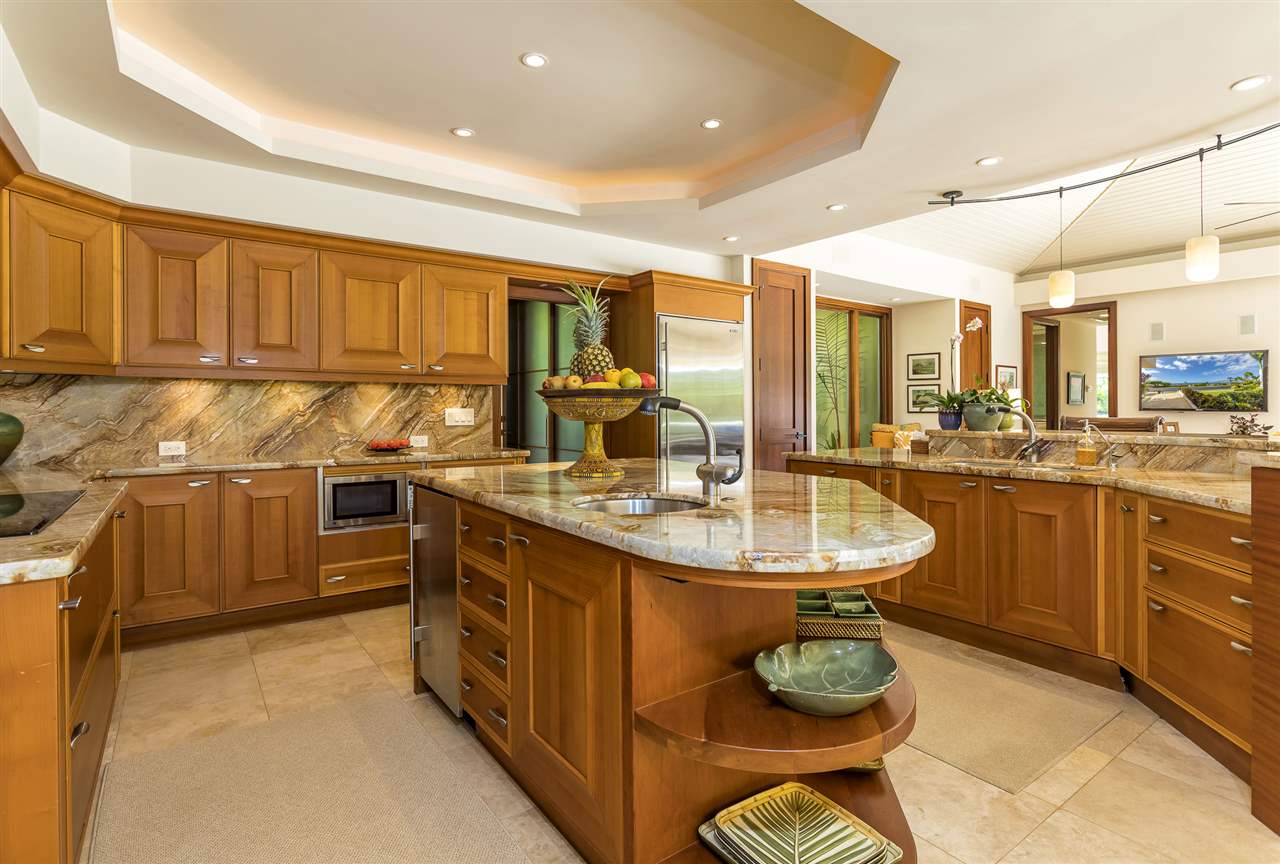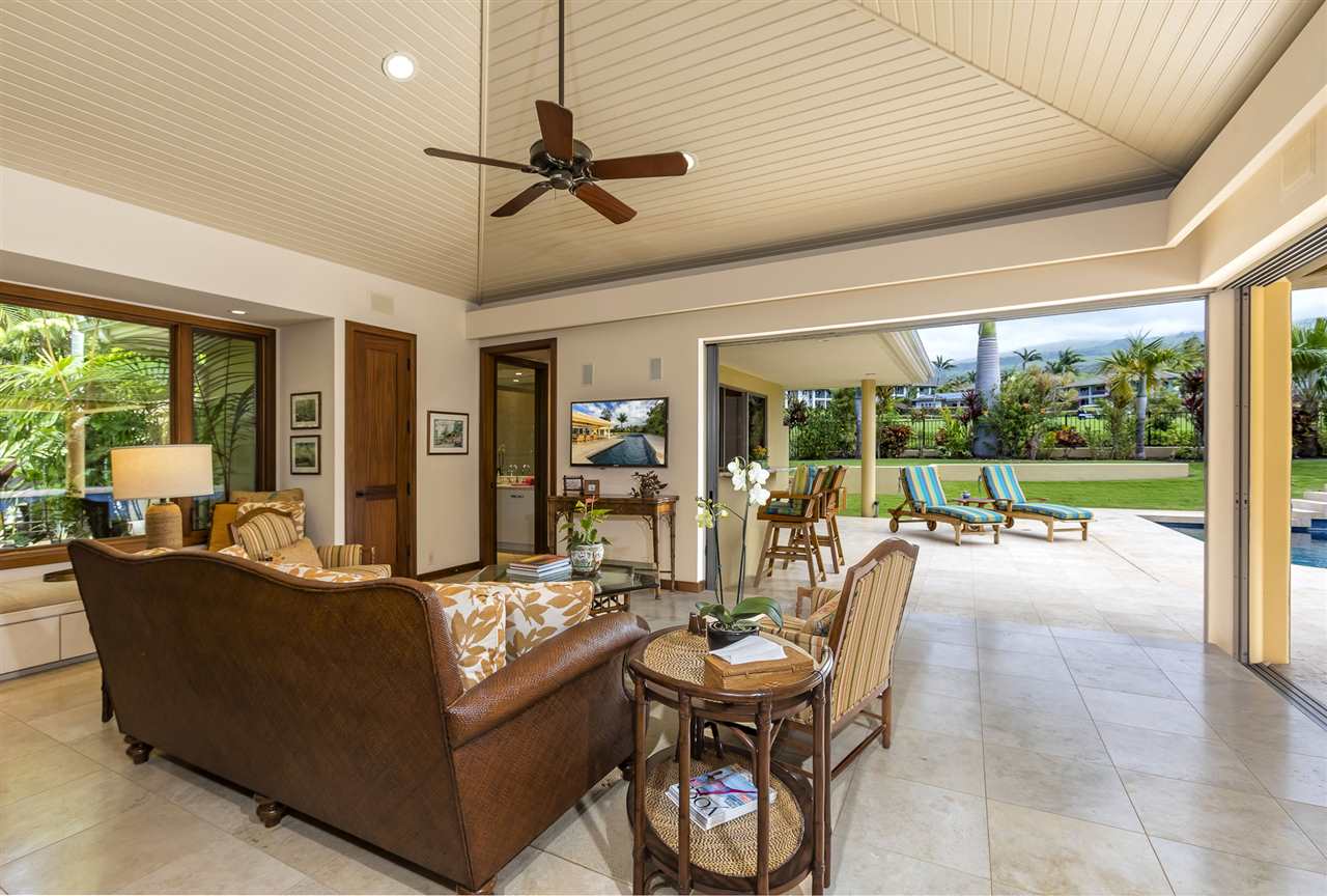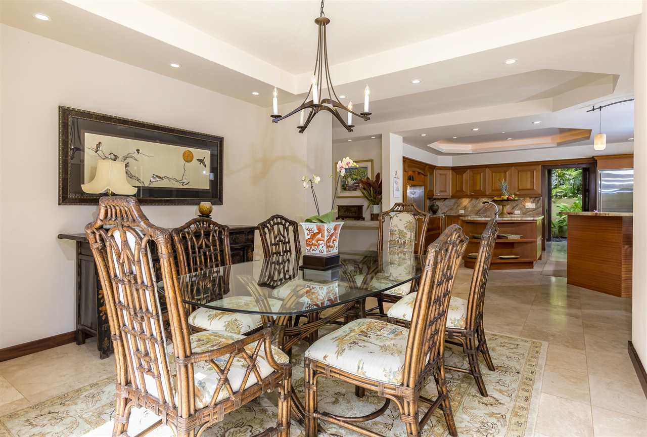Lift your eyes to the Mountains! Look to the east from the open family room and see the sun rise over Haleakala and fill your beautiful kitchen with morning sun. Look to the west from the upstairs Master Bedroom lanai to the majestic West Maui Mountains as the sun sets over the Pacific. So many living areas in this home to be alone or together. Two bedrooms (each with an ensuite bath) and open office area upstairs with separate lanais, one with Haleakala view and one with ocean views. Lovely living room for reading or watching TV and another bedroom with ensuite bath downstairs if anyone has trouble with stairs. Elevator might be possible. But where you end up living is in the kitchen, family room – so warm and welcoming with its window seat. The heated pool is beautifully designed as it is protected from the tradewinds by the bedroom wing. This home designed by Tim Farrington, is on the mauka side of Wailea Ekolu Place and has the beautiful Wailea Blue Golf Course as its backyard. It is elegantly and tastefully furnished. Move in and start living in wonderful Wailea!