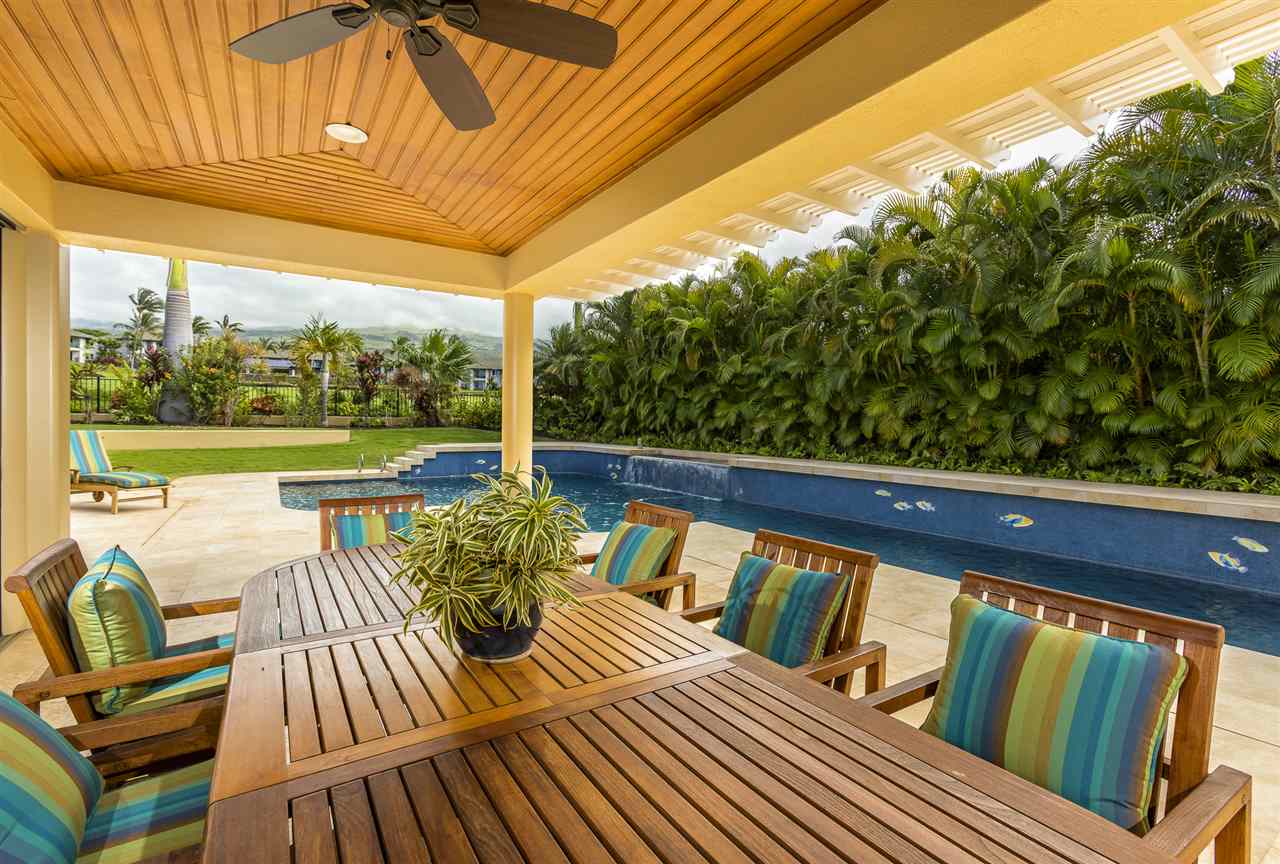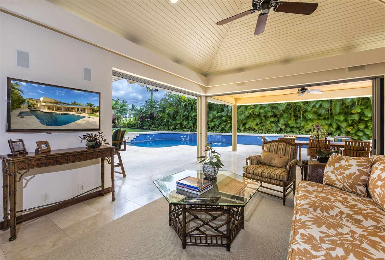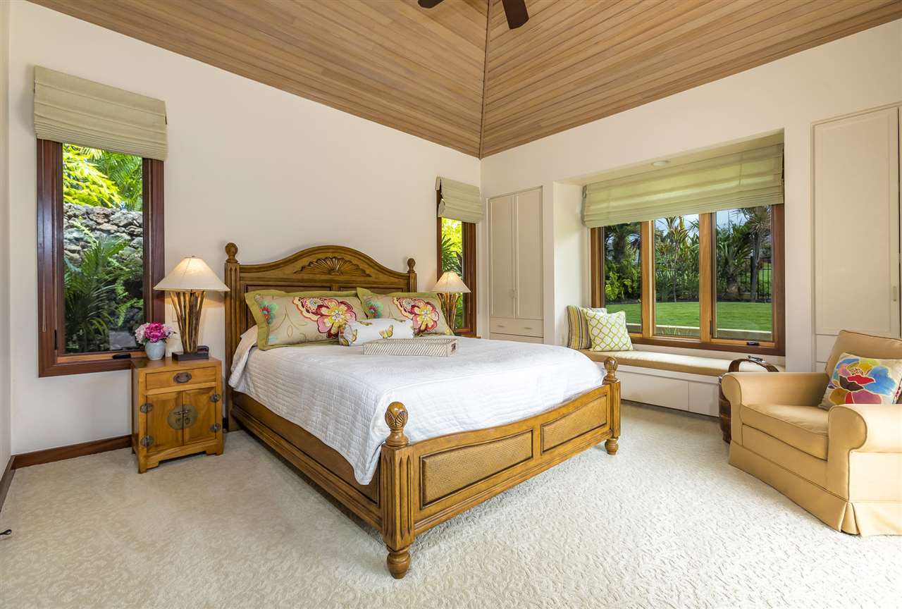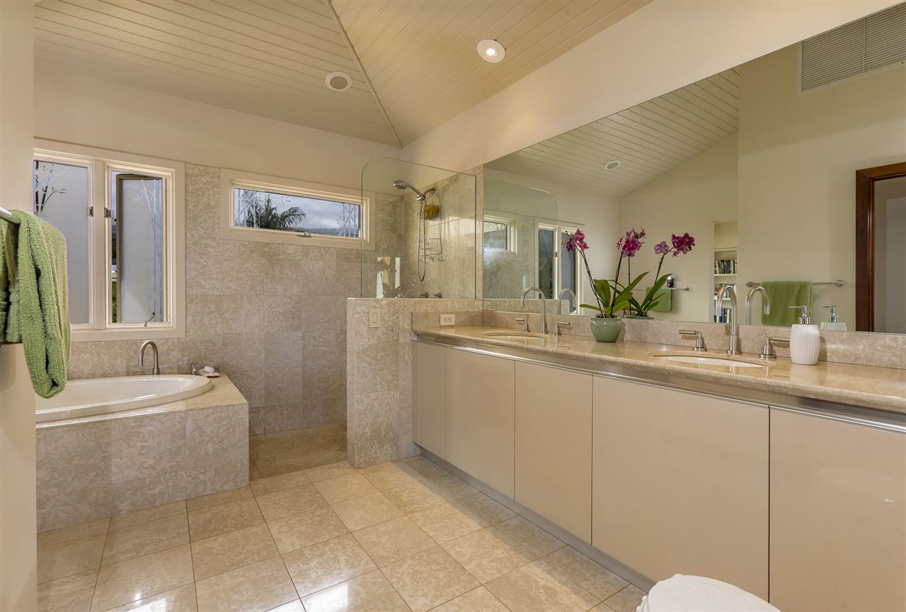 Lift your eyes to the Mountains! Look to the east from the open family room and see the sun rise over Haleakala and fill your beautiful kitchen with morning sun. Look to the west from the upstairs Master Bedroom lanai to the majestic West Maui Mountains as the sun sets over the Pacific. So many living areas in this home to be alone or together. Two bedrooms (each with an ensuite bath) and open office area upstairs with separate lanais, one with Haleakala view and one with ocean views. Lovely living room for reading or watching TV and another bedroom with ensuite bath downstairs if anyone has trouble with stairs. Elevator might be possible. But where you end up living is in the kitchen, family room – so warm and welcoming with its window seat. The heated pool is beautifully designed as it is protected from the tradewinds by the bedroom wing. This home designed by Tim Farrington, is on the mauka side of Wailea Ekolu Place and has the beautiful Wailea Blue Golf Course as its backyard. It is elegantly and tastefully furnished. Move in and start living in wonderful Wailea!