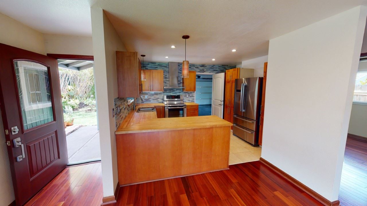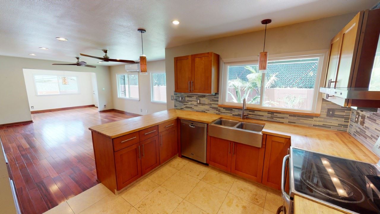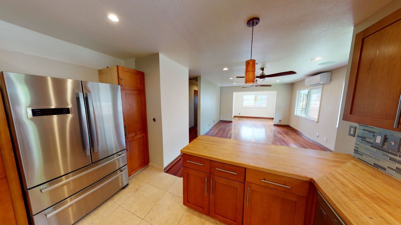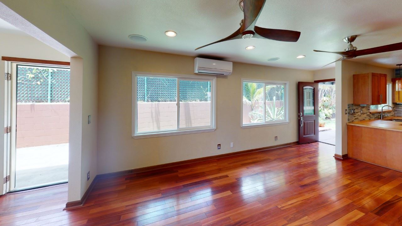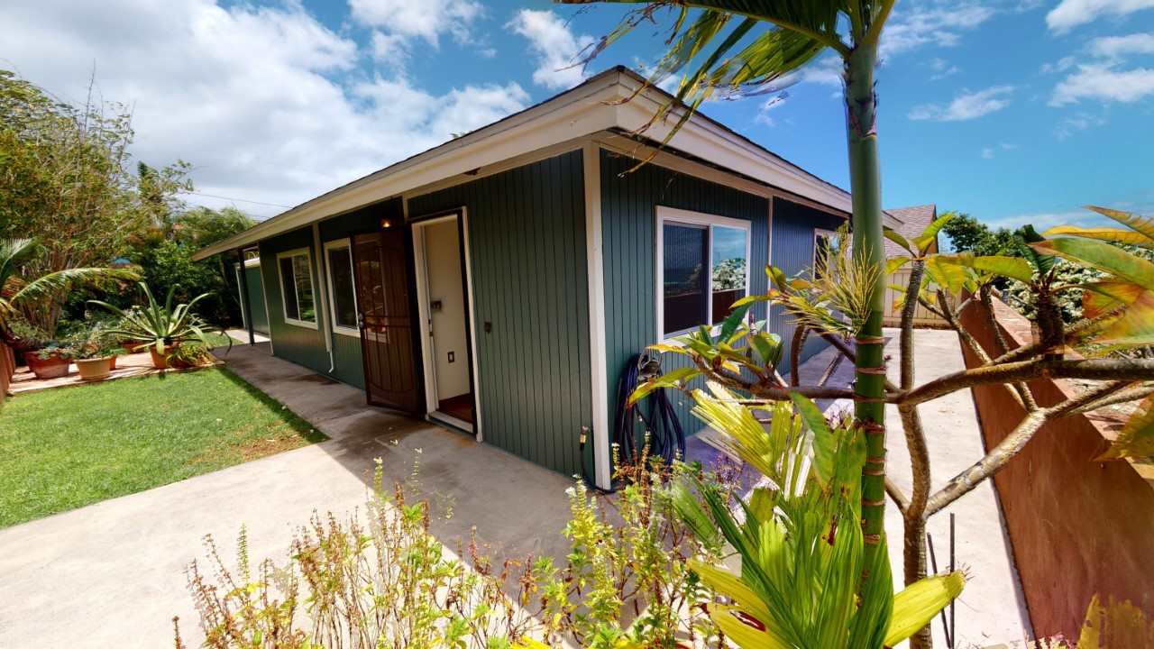 Enjoy the privacy and comfort of this lushly landscaped and upgraded home. The kitchen is well equipped with abundant wood cabinets, stainless steel appliances (Bosch refrigerator, LG glass surface range, Maytag dishwasher, Arietta range hood), 18" x 18" cream colored travertine floors, aqua/green glass mosaic backsplash/accent wall, and handmade maple countertops. The main bathroom features a handcrafted oversized black cement soaking tub, pewter sink with concrete countertop, 2' x 2' lava floors, and travertine wainscoting with a lava border. The master bathroom floors are lava tile and glass, the shower is dark grey basalt and basketweave marble, the sink is porcelain with a white quartz countertop, and the walls are accented with basalt and tongue and groove beadboard. Other upgrades include Mitsubishi split air conditioning in each bedroom and the living area, engineered tigerwood flooring in the living areas and bedrooms, Minka Aire "Aviation" ceiling fans in each bedroom and living areas, recessed and pendant lighting added throughout the home, built in speakers, UV/IR blocking double pane vinyl windows, detailed fiberglass exterior doors, and security screen doors. There is an attached 2 car garage with an epoxied floor with glow in the dark chips, the laundry area, and additional storage areas. The fenced yard includes many varieties of plants, a large lava rock wall planter, and a quartz rock covered patio. There are amazing ocean and Haleakala views from the back facing rooms and back yard of the property. See the Matterport 3D tour for a virtual walk through.