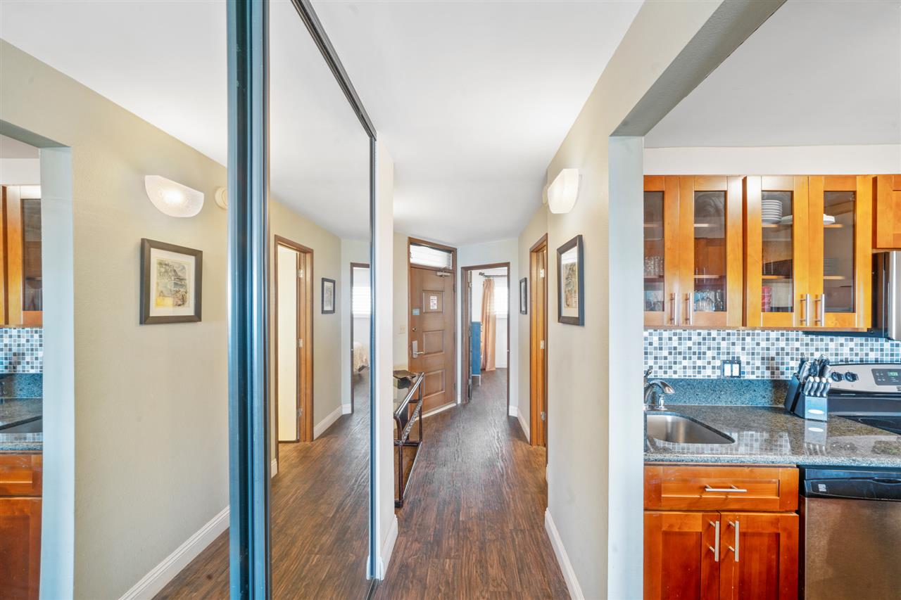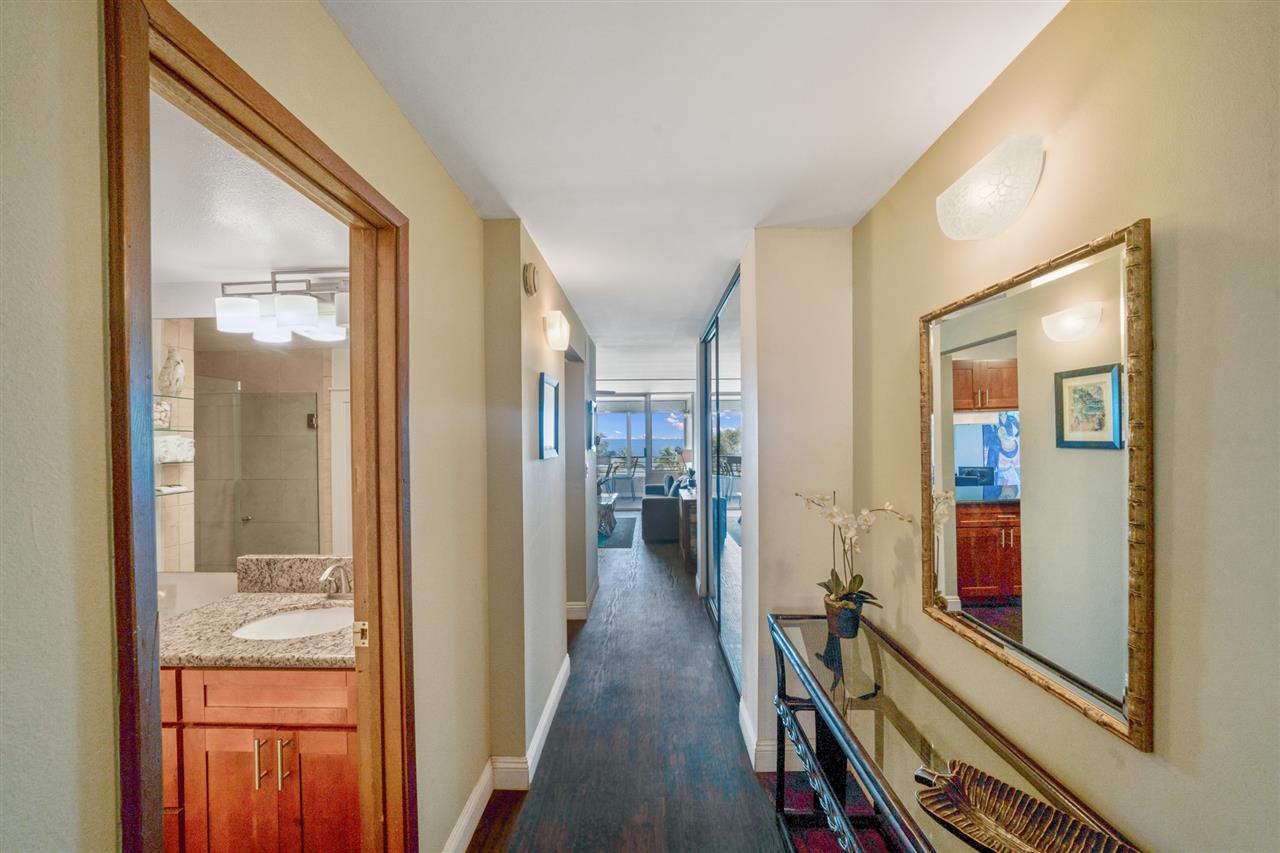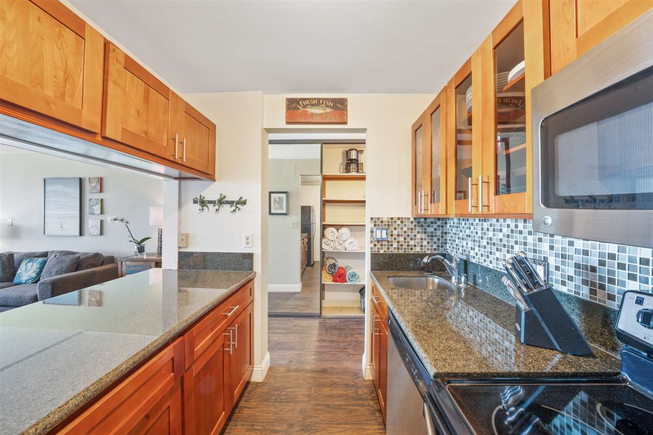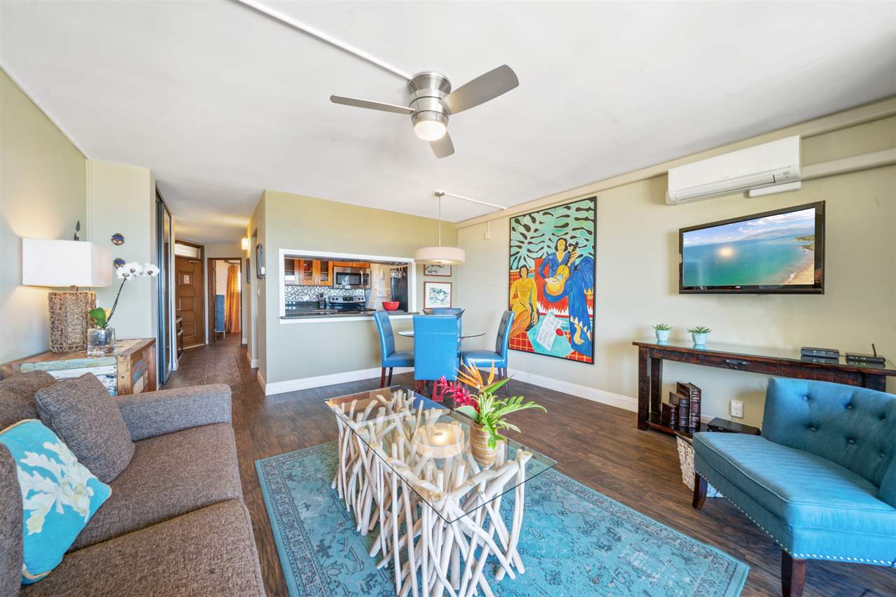 WOW and WOW is the feeling you will experience when you enter this beautifully renovated 6th floor condo with the back drop of the blue Pacific Ocean sparkling in the background while also seeing and hearing the gentle waves crash along the sandy shoreline. WATCH THE VIRTUAL TOUR FOR DRAMATIC AERIAL VIEWS! TRULY A MUST SEE and INCREDIBLE VALUE in today's rising condo market for vacation rental ready units! E Komo Mai (Welcome) to Kamaole Beach Royale (KBR)… a hidden gem tucked away from the main road and standing tall and proud as it commands outstanding views of surrounding islands and mountain views. This upgraded one bedroom/one bath unit is appointed with the following: fully renovated kitchen with dark granite counter tops, mosaic glass backsplash, custom cherry wood cabinets, stainless steel appliance package; fully renovated bathroom with step-in shower design and glass door; 2 zone Split AC system in living and bedroom for those days when you desire; ample sized covered lanai ideal for entertaining and outdoor dining; popcorn ceilings removed; updated flooring throughout; king size bed in bedroom with mirrored closet doors and ceiling fan; and stylish furniture package throughout creates a sophisticated yet casual beach vibe! KBR is in the heart of South Kihei's beach district and minutes access to some of the best dining spots/eateries/food trucks, natural food store, shops, services and some of the best sandy beaches on the island (my opinion!) known as Kamaole Beach 1, 2 and 3 (take time to stroll, snorkel and swim with the turtles daily!) Make KBR unit 608 your primary or secondary home, or monetize as a vacation rental investment unit, so many options! You won't regret. BONUS: Don't forget to catch even more amazing daily sunsets on the roof top deck and chill out with ohana and friends for cocktails and barbecue nights! Opportunity knocks …enjoy the beach life you desire at KBR!