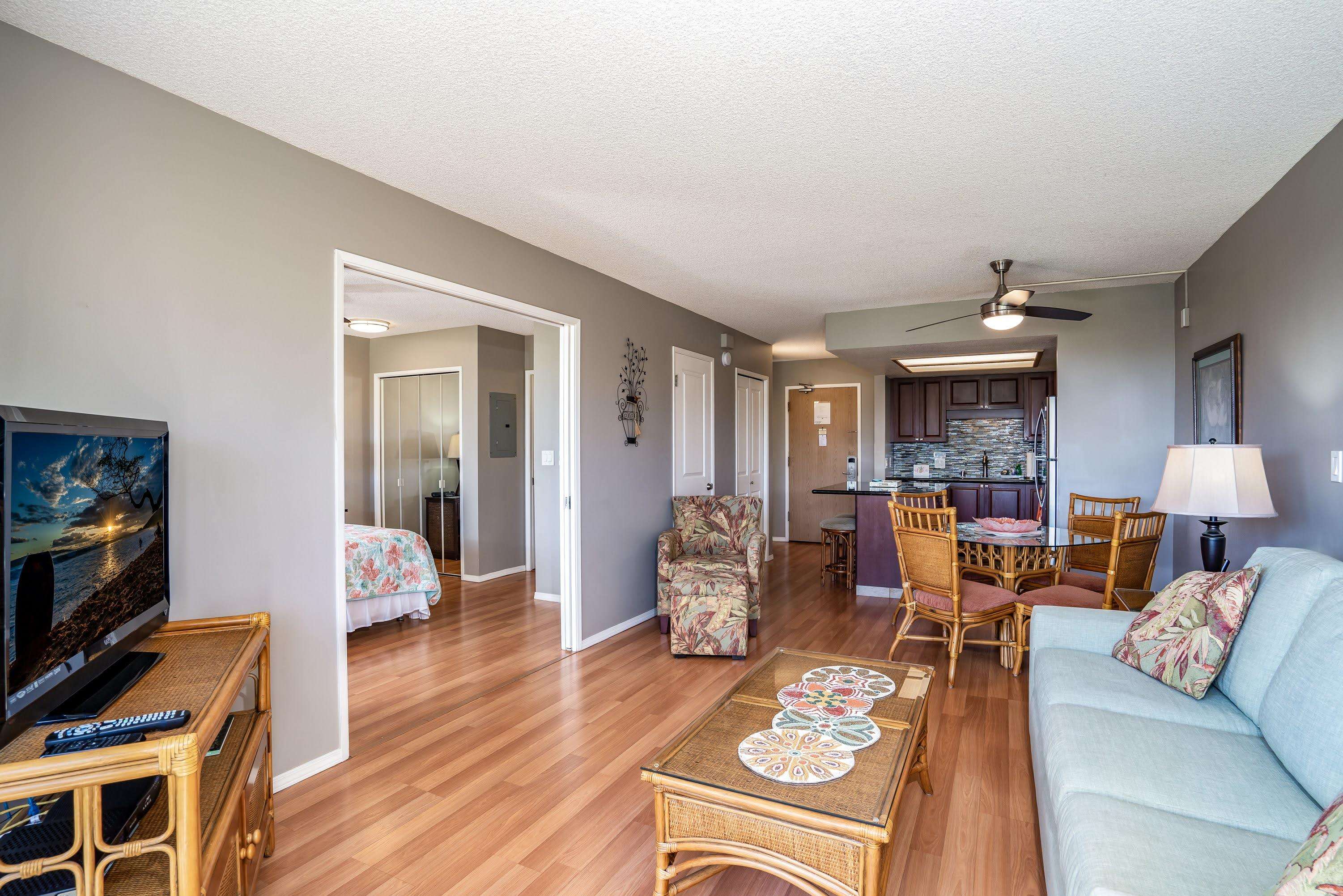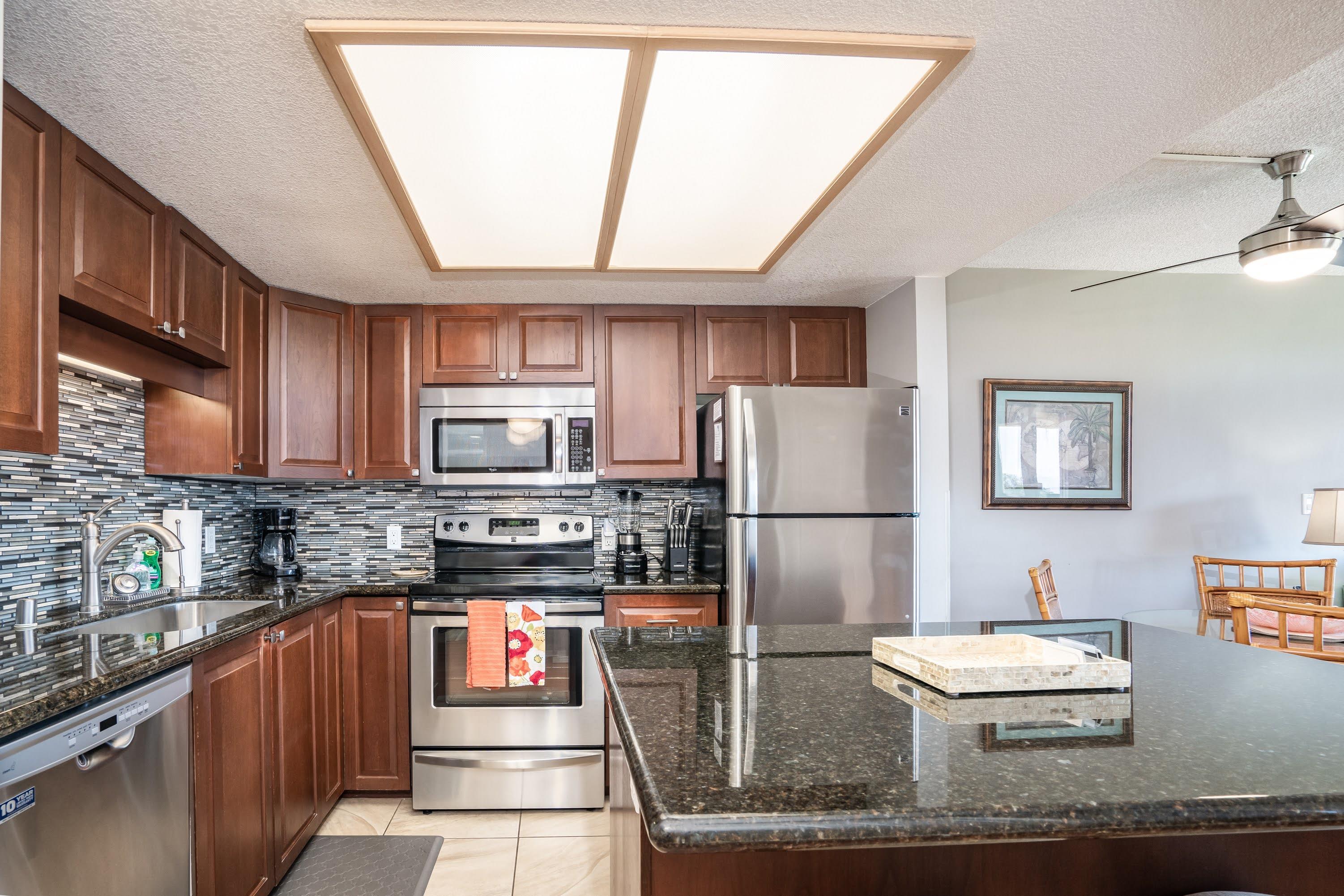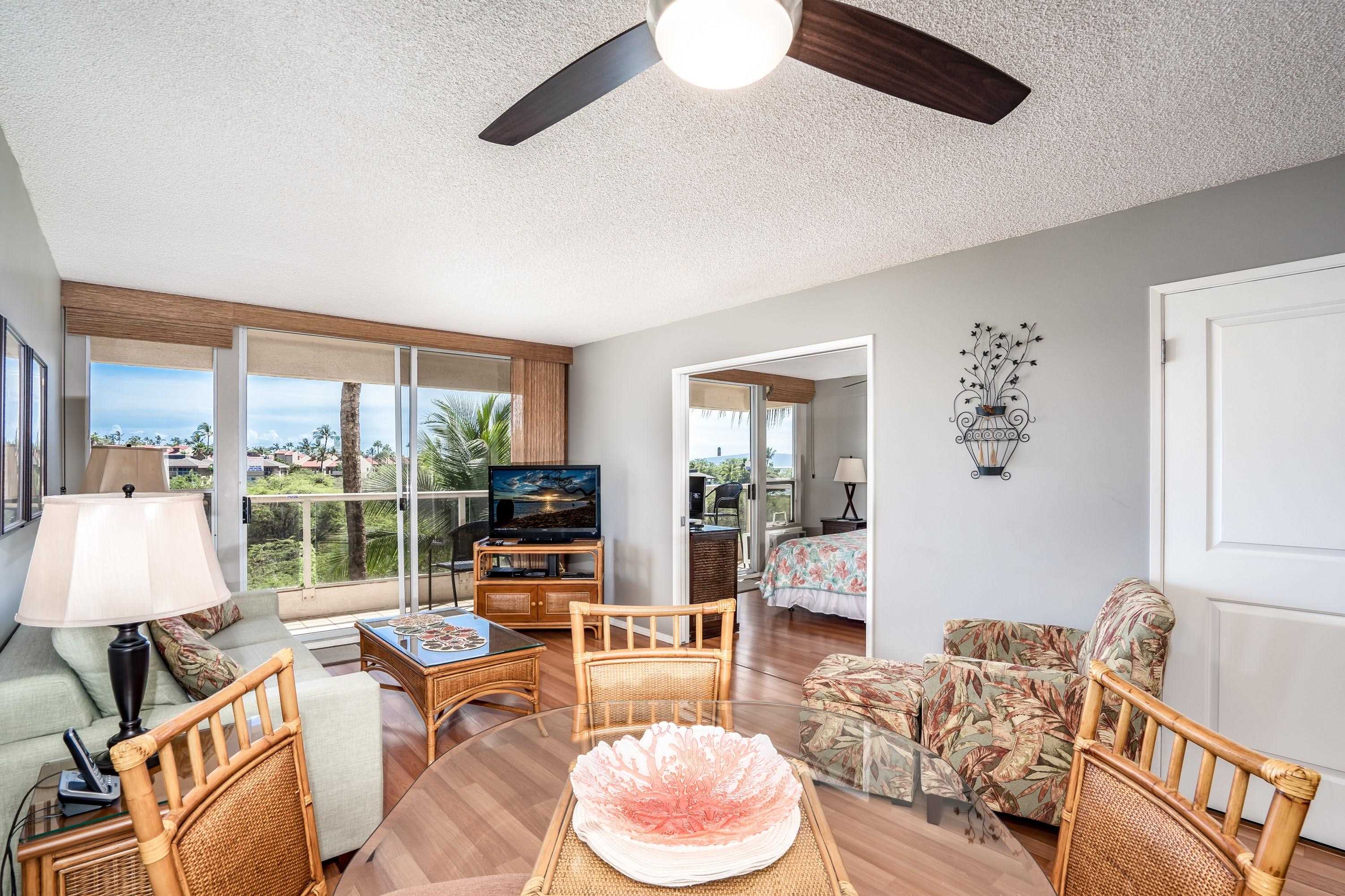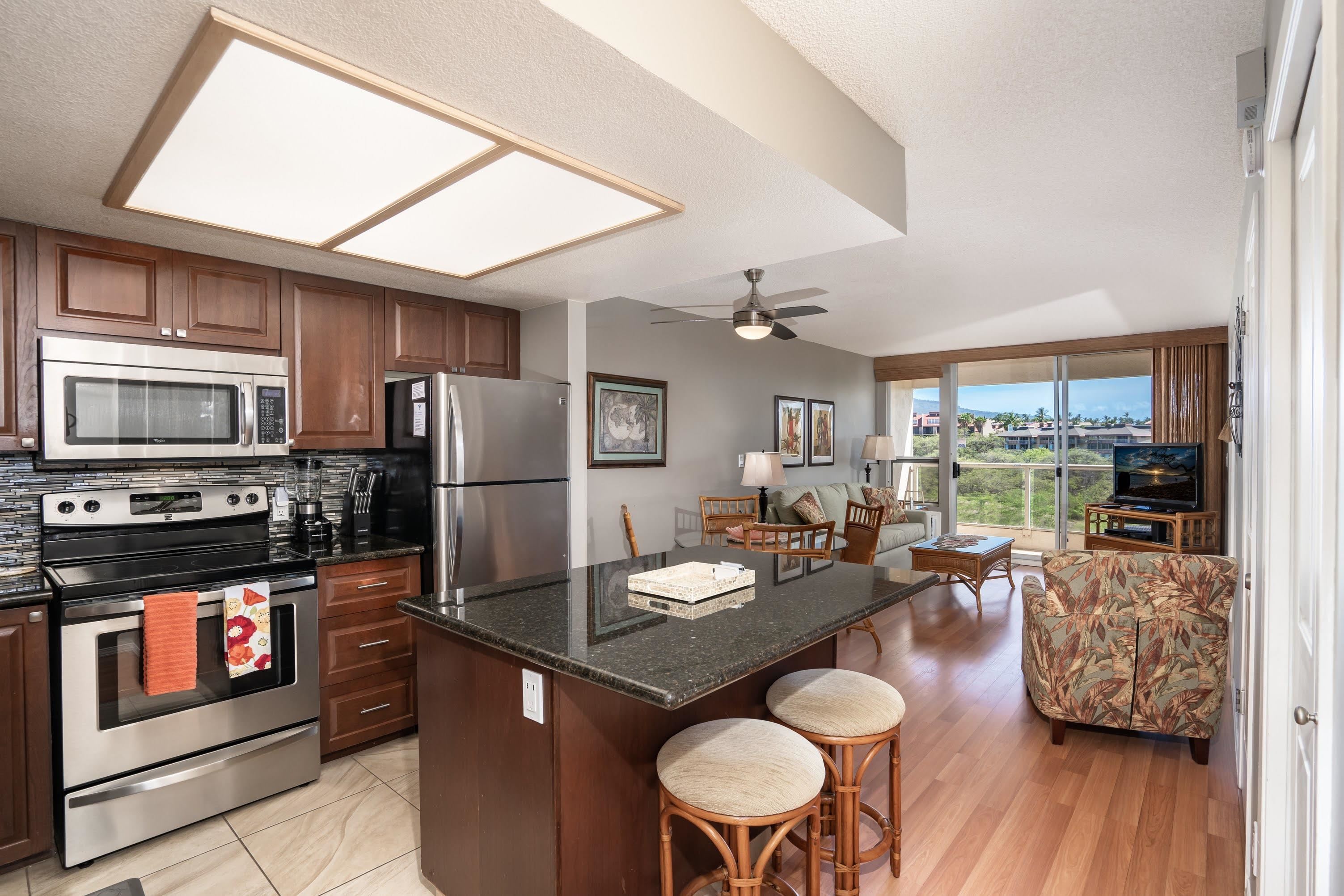 Maui Banyan Resort is an ideal vacation destination, beautifully landscaped with 2 heated pools, 2 hot tubs barbecue grills, a tennis court, front desk and a covered parking garage. Property is located directly across the street from Kamaole 2 Beach Park, one of Maui's best beaches for all your ocean activities! This bright upgraded south facing one bedroom two bath heavily booked vacation rentable condominium on the fourth floor features views of Haleakala and partial ocean view, air conditioning, upgraded bathrooms, a fully equipped upgraded kitchen, washer and dryer in this fully equipped upgraded kitchen washer and dryer in this fully furnished condominium with all the comforts of home.
