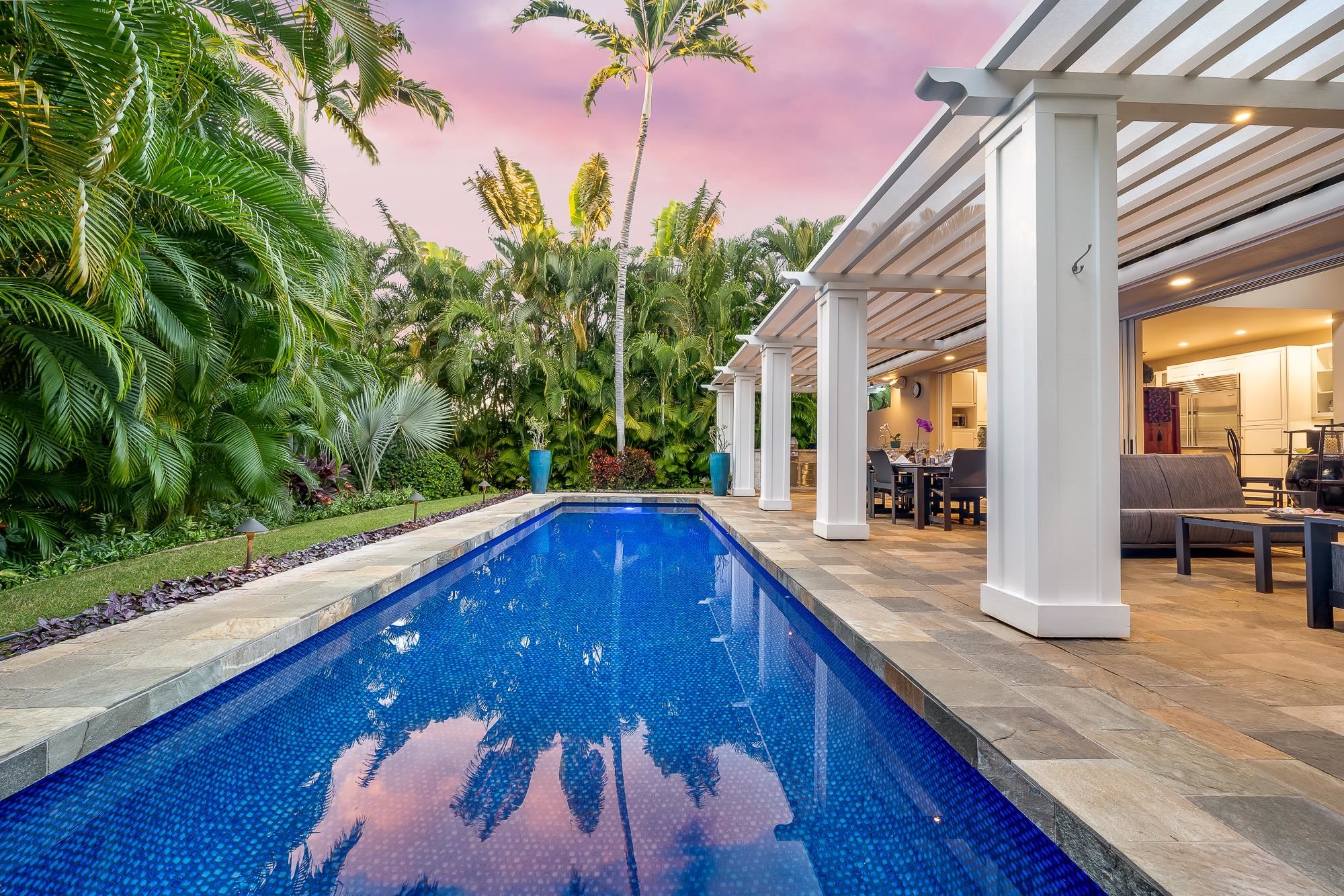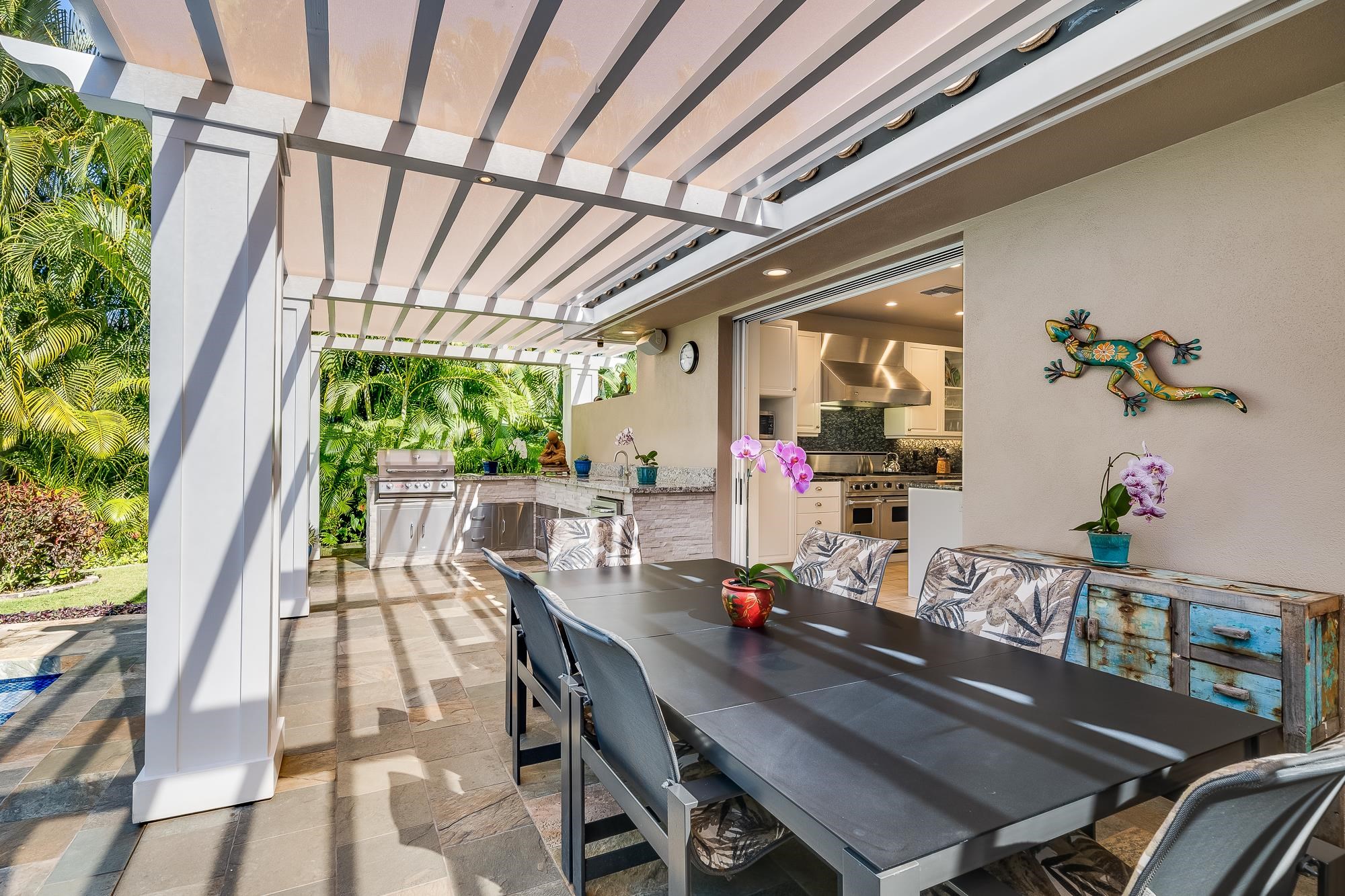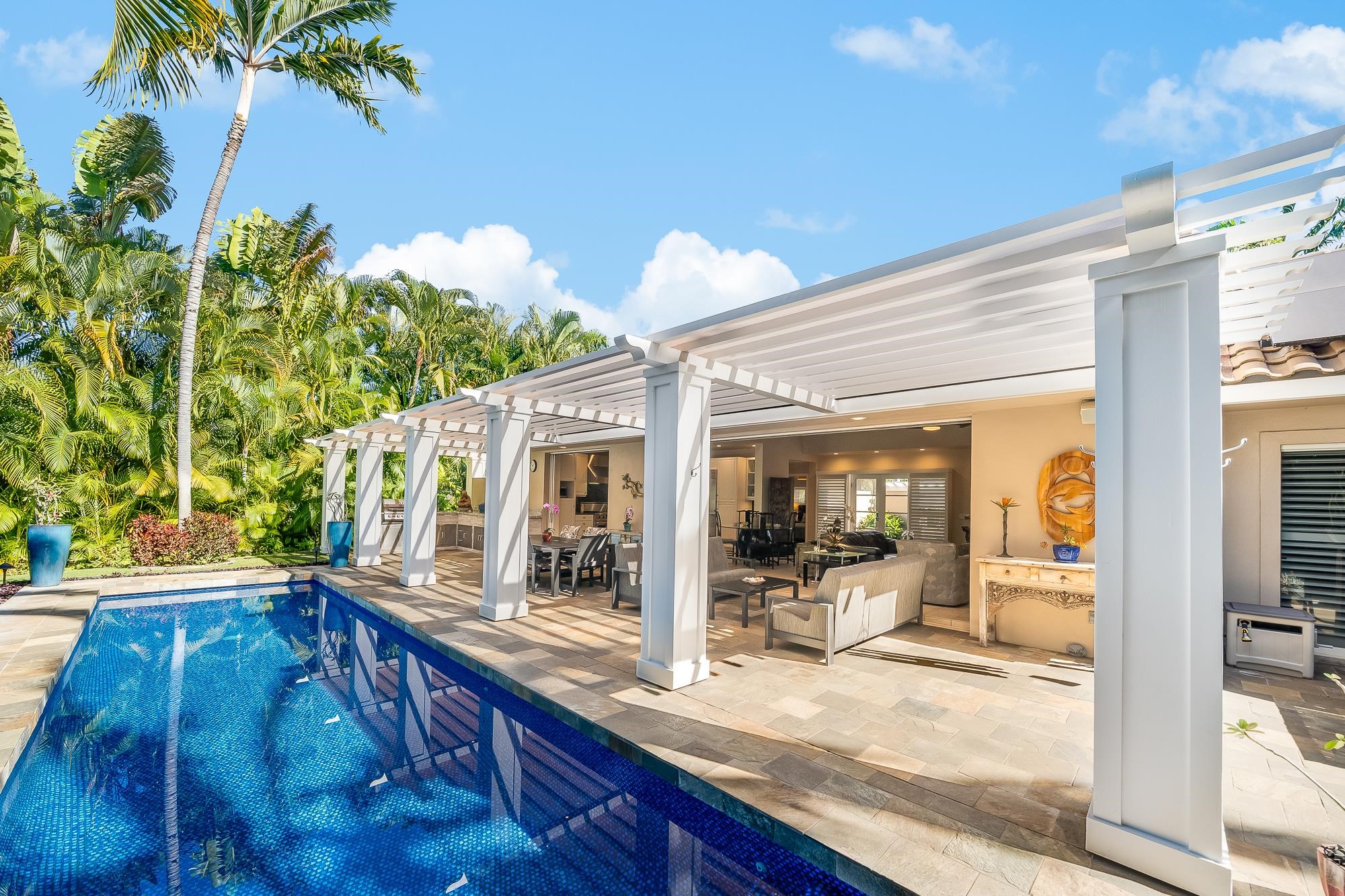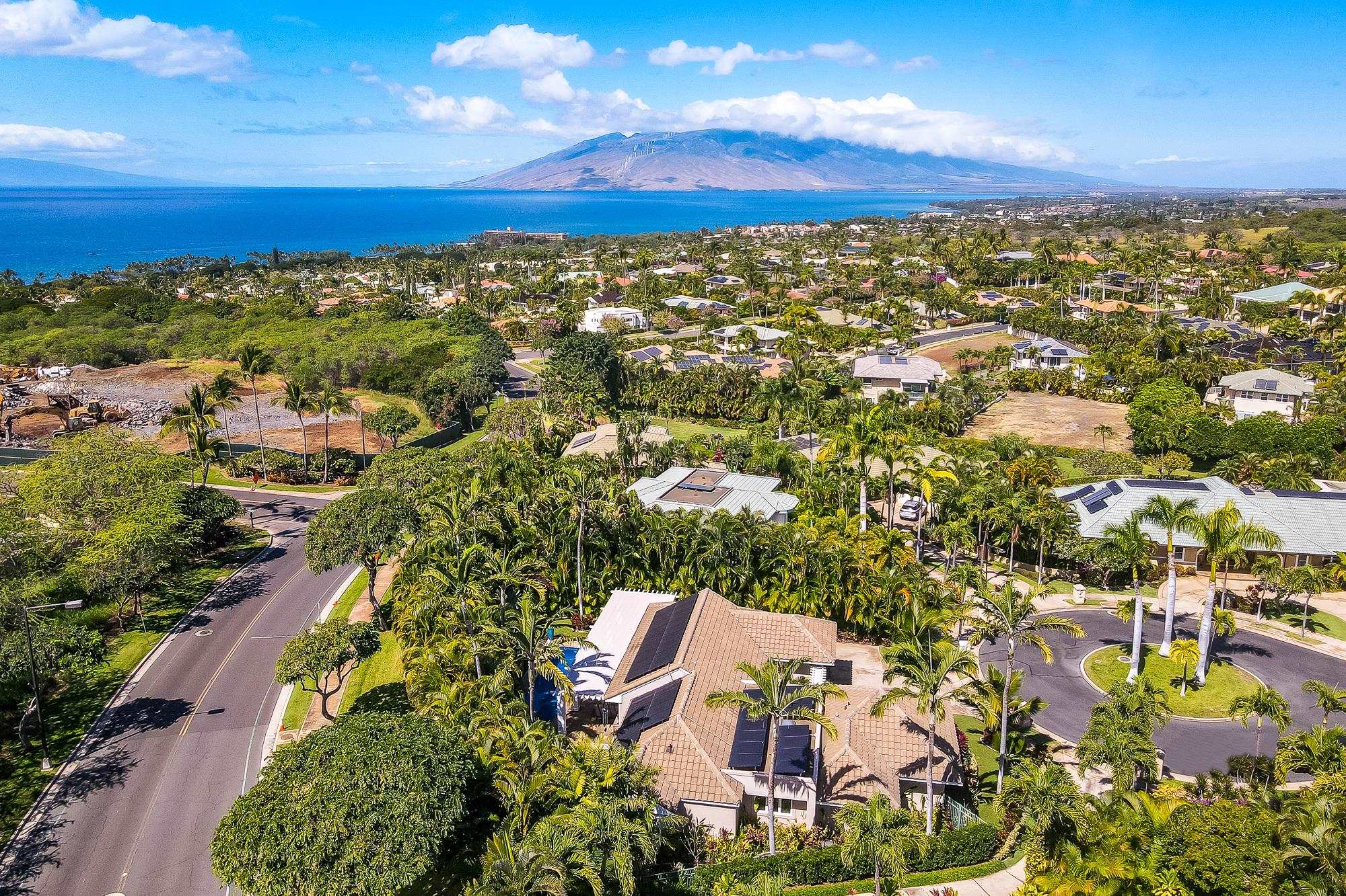 Artistic landscaping and modern interiors are combined in this attractive Wailea home. A spacious, open floor plan and chefs kitchen lead to an outdoor heated pool and covered lanai, making this the perfect setting to host and entertain guests. You will be able to enjoy South Mauis comfortable year-round climate and walk to its world class dining and shopping options thanks to the location of this 3-bedroom, 3-bath home. Located in the pristine gated community of Wailea Pualani, this elegant space features spectacular natural lighting throughout. The home is further illuminated by floor to ceiling pocketing glass doors dressed with electric shades that lead to a quartzite tiled lanai and outdoor kitchen with a built-in grill, refrigerator & wet bar. The exceptional master suite comes replete with bamboo wood floors and a large walk-in closet. The accompanying master bath features a deep spa tub and double shower. The home comes completely furnished and even includes 44 PV Solar Panels, 2 Tesla Batteries, high-end surround sound in the master suite, living room and lanai area. Come Surround yourself with paradise.