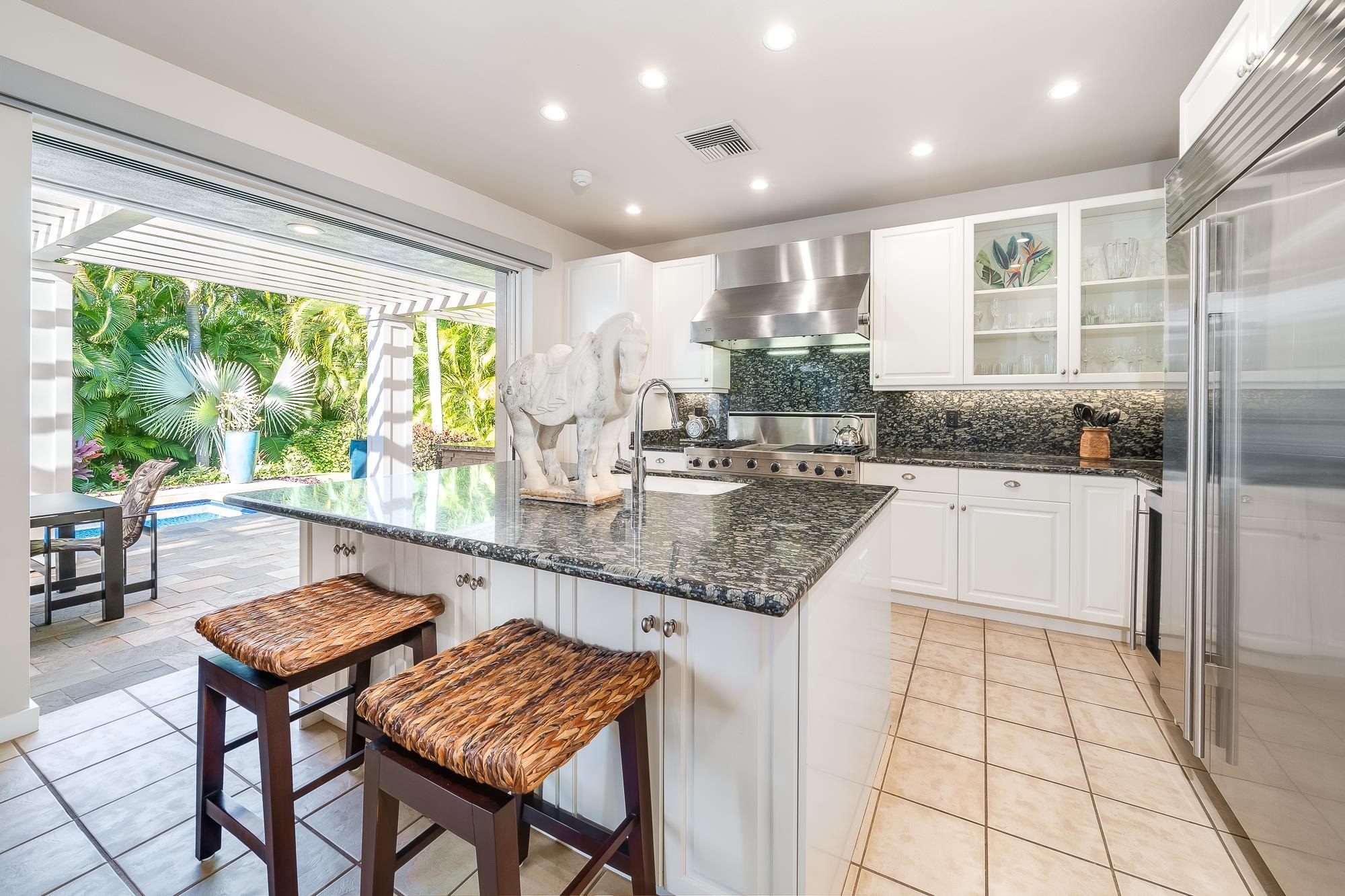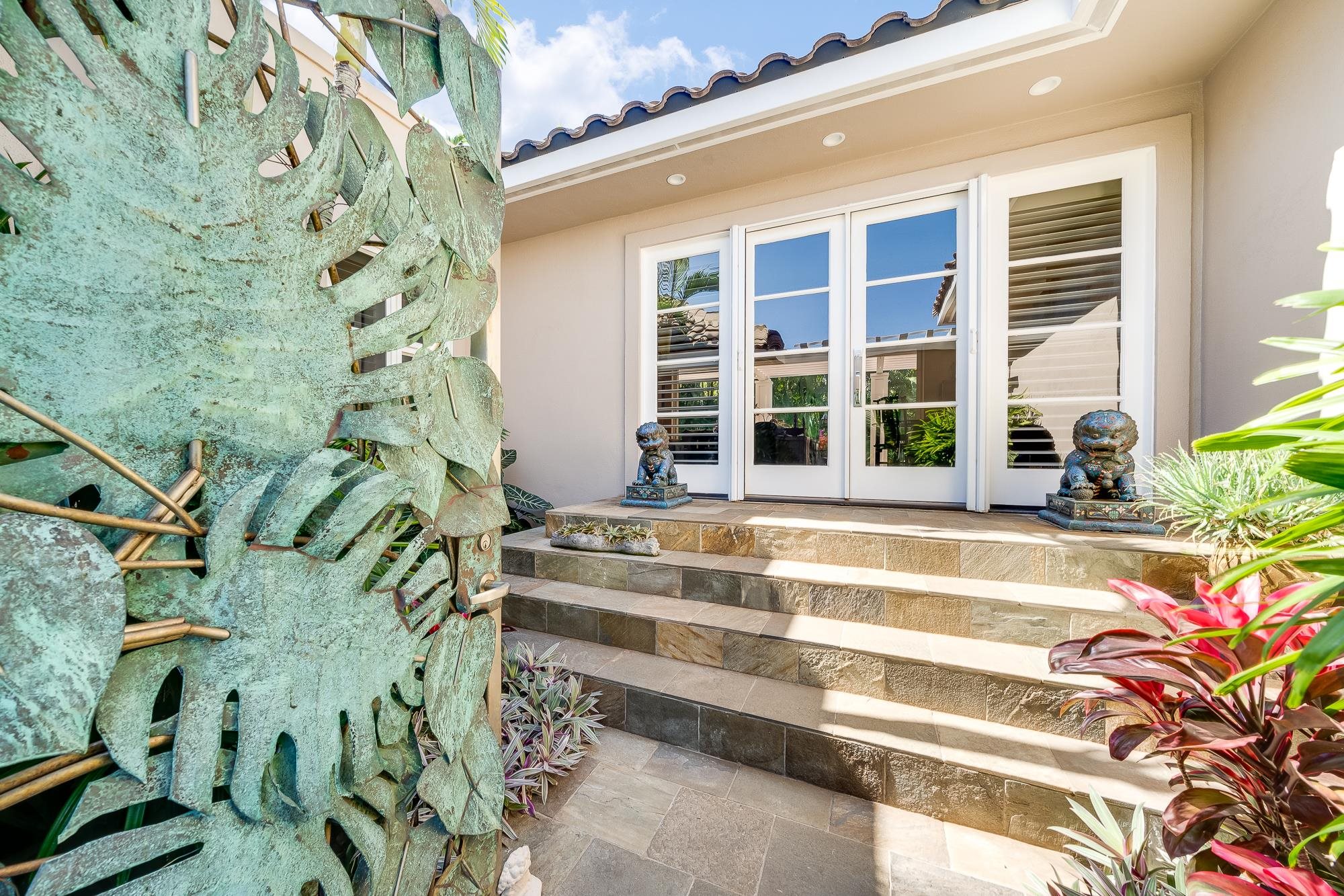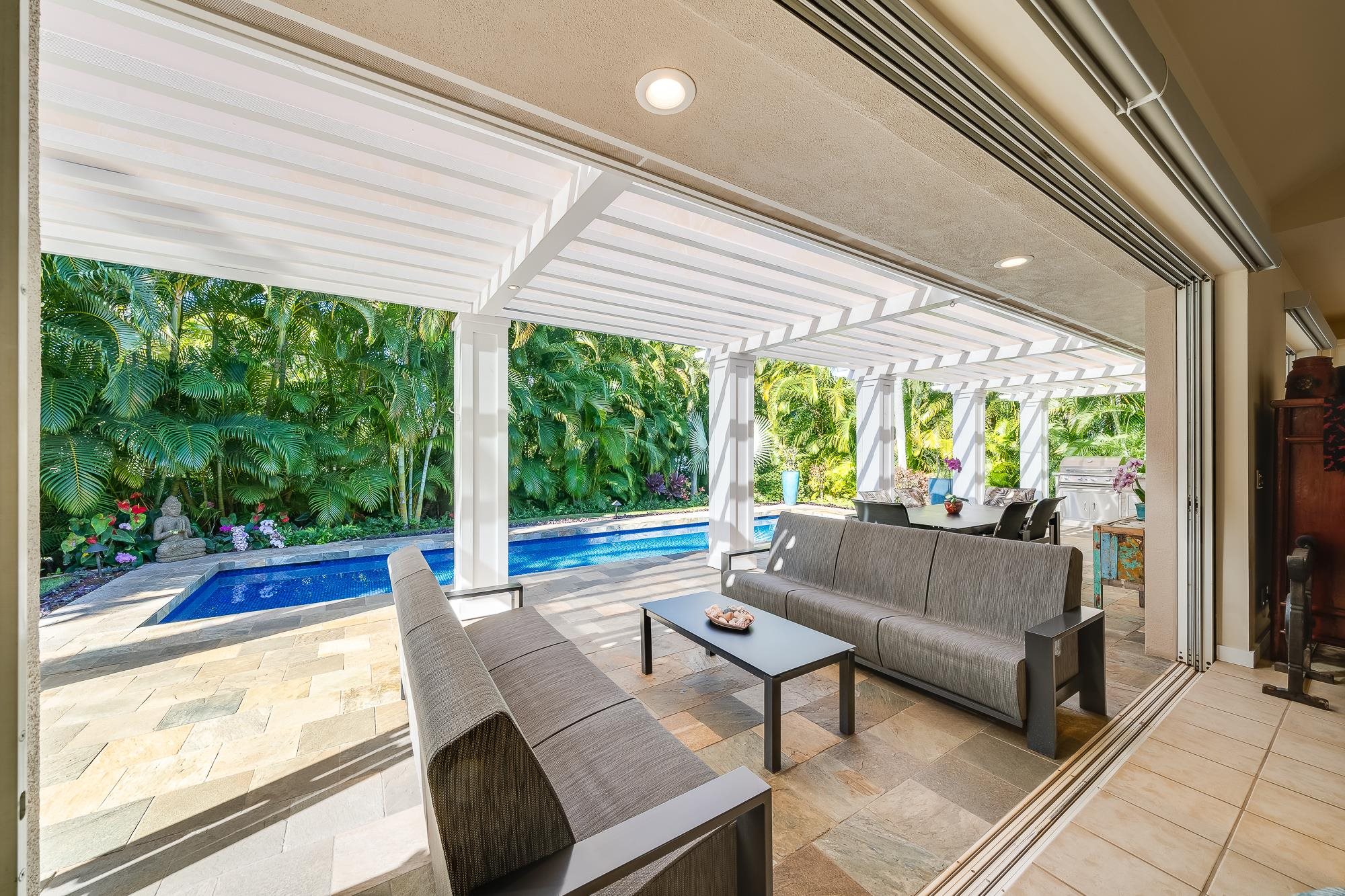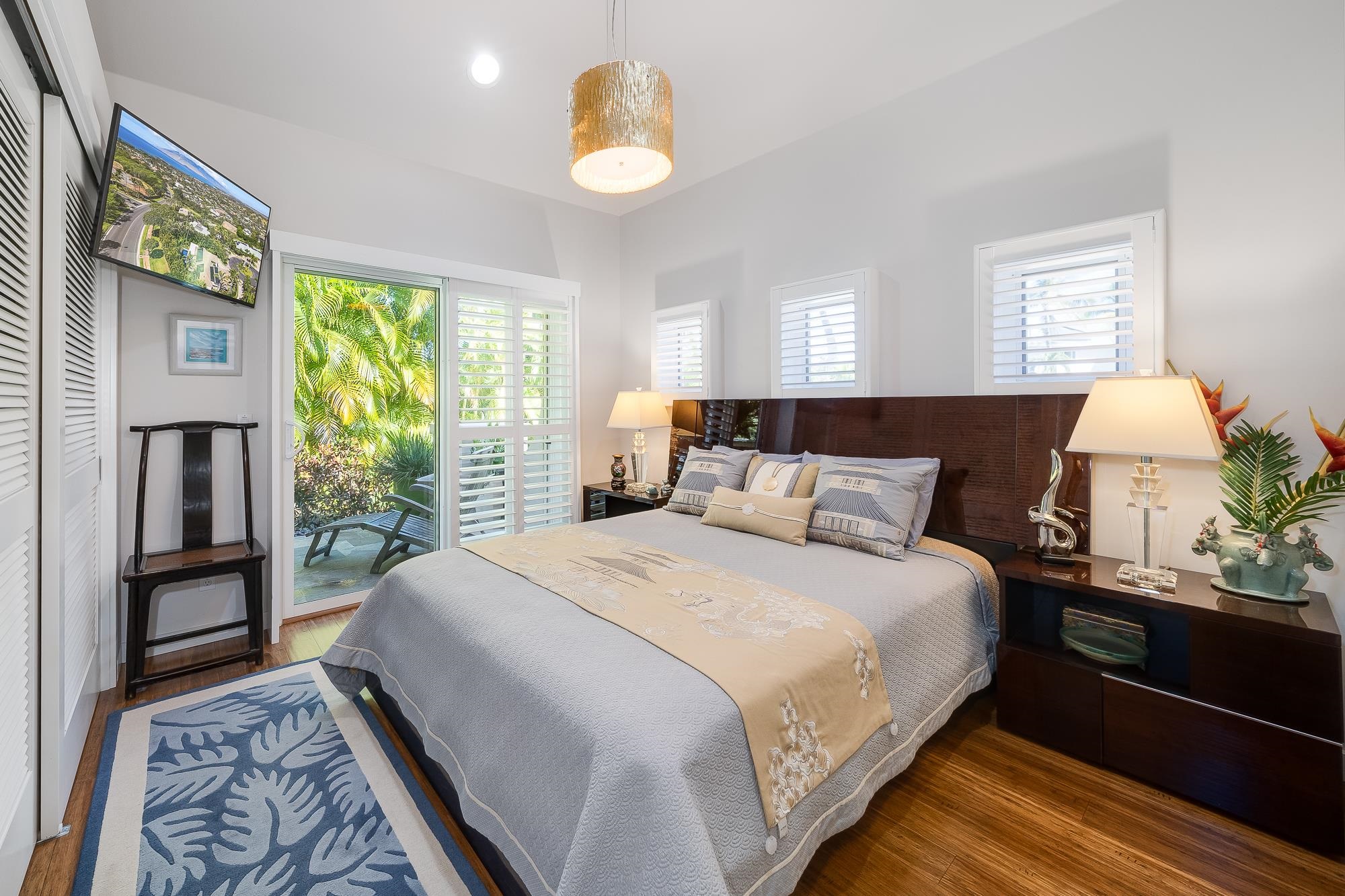 Artistic landscaping and modern interiors are combined in this attractive Wailea home. A spacious, open floor plan and chefs kitchen lead to an outdoor heated pool and covered lanai, making this the perfect setting to host and entertain guests. You will be able to enjoy South Mauis comfortable year-round climate and walk to its world class dining and shopping options thanks to the location of this 3-bedroom, 3-bath home. Located in the pristine gated community of Wailea Pualani, this elegant space features spectacular natural lighting throughout. The home is further illuminated by floor to ceiling pocketing glass doors dressed with electric shades that lead to a quartzite tiled lanai and outdoor kitchen with a built-in grill, refrigerator & wet bar. The exceptional master suite comes replete with bamboo wood floors and a large walk-in closet. The accompanying master bath features a deep spa tub and double shower. The home comes completely furnished and even includes 44 PV Solar Panels, 2 Tesla Batteries, high-end surround sound in the master suite, living room and lanai area. Come Surround yourself with paradise.