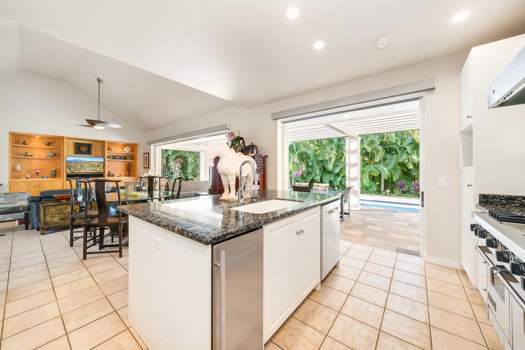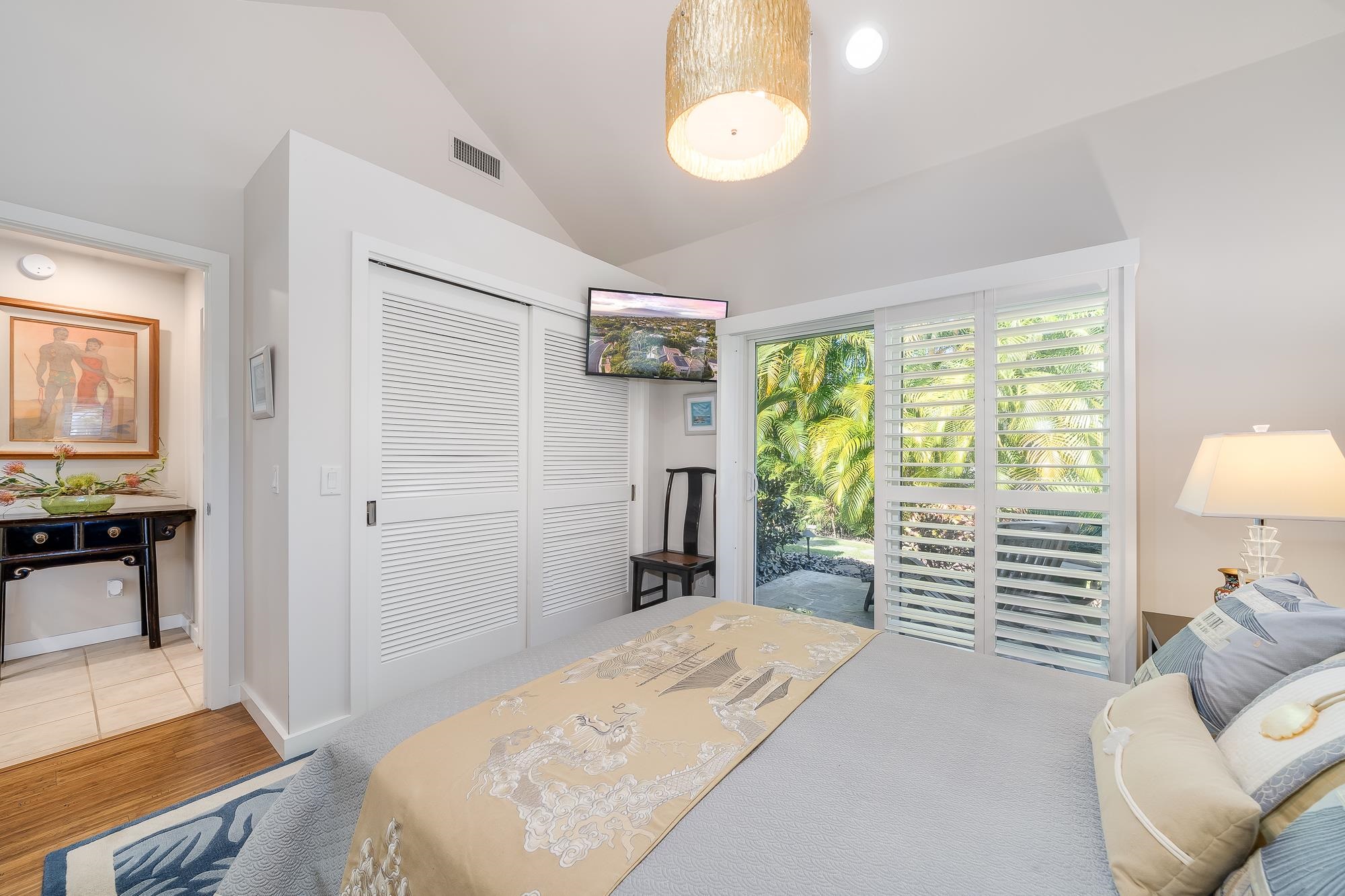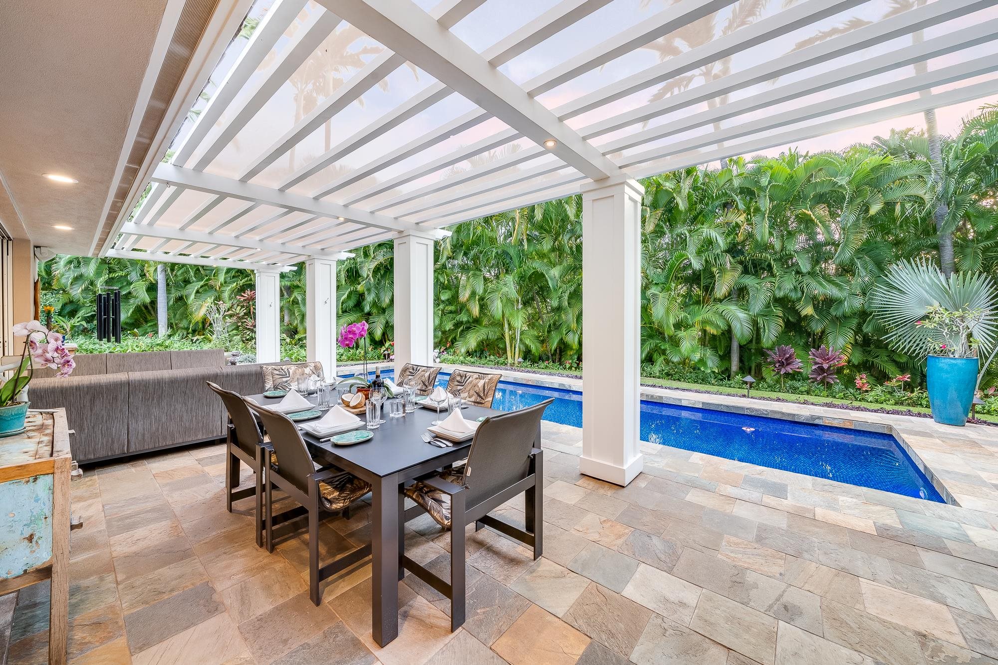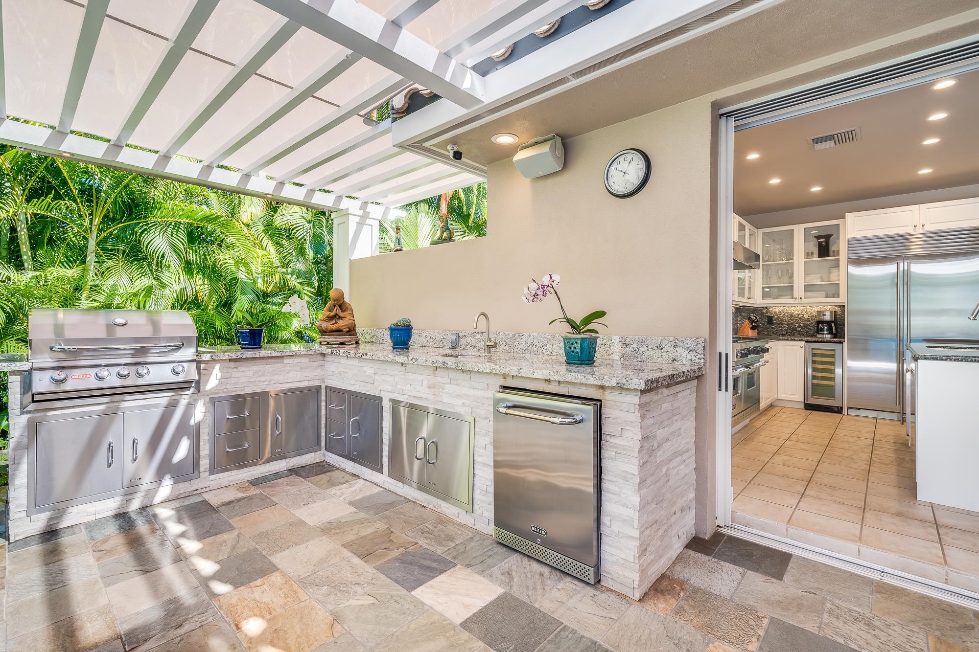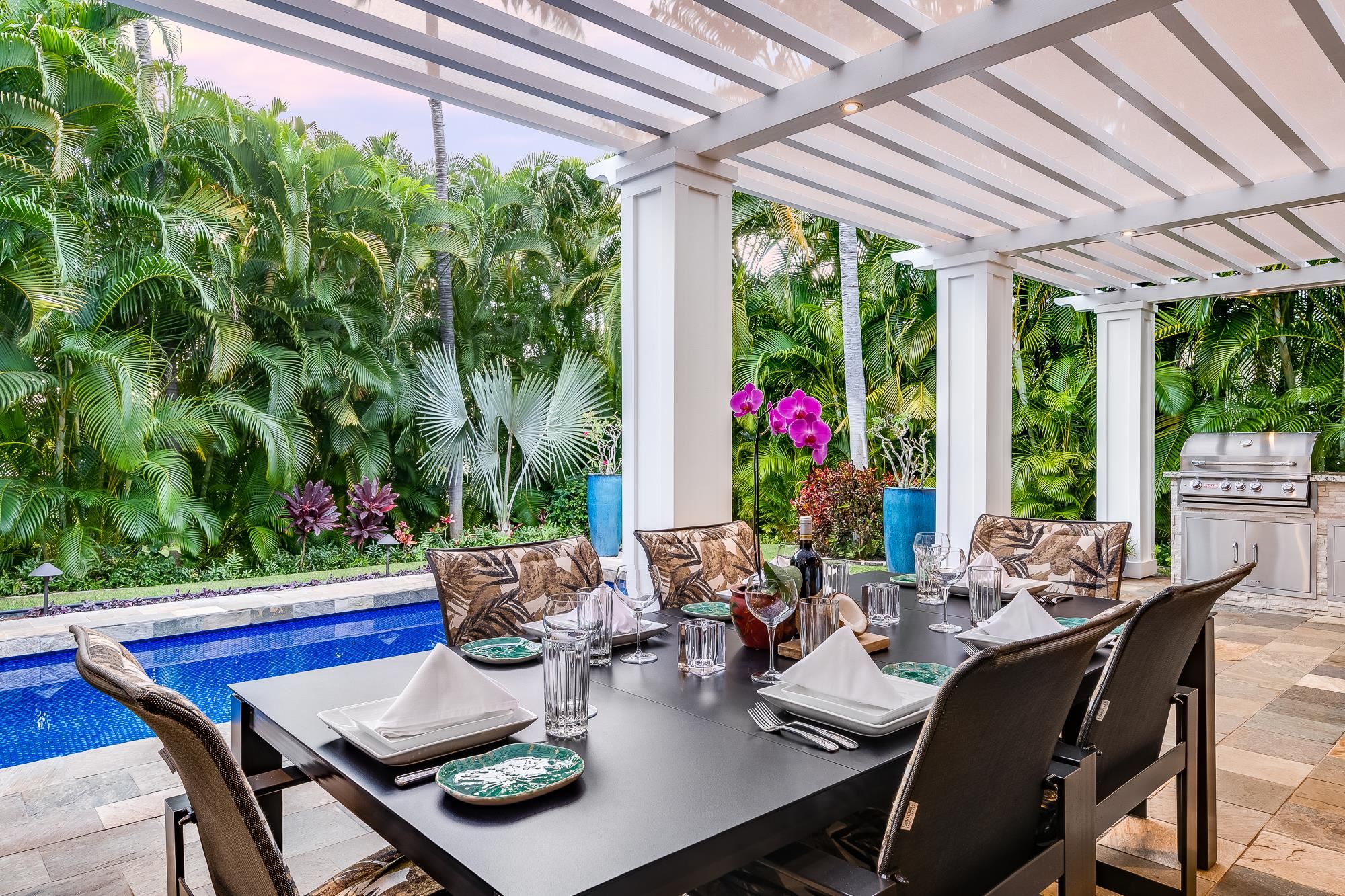 Artistic landscaping and modern interiors are combined in this attractive Wailea home. A spacious, open floor plan and chefs kitchen lead to an outdoor heated pool and covered lanai, making this the perfect setting to host and entertain guests. You will be able to enjoy South Mauis comfortable year-round climate and walk to its world class dining and shopping options thanks to the location of this 3-bedroom, 3-bath home. Located in the pristine gated community of Wailea Pualani, this elegant space features spectacular natural lighting throughout. The home is further illuminated by floor to ceiling pocketing glass doors dressed with electric shades that lead to a quartzite tiled lanai and outdoor kitchen with a built-in grill, refrigerator & wet bar. The exceptional master suite comes replete with bamboo wood floors and a large walk-in closet. The accompanying master bath features a deep spa tub and double shower. The home comes completely furnished and even includes 44 PV Solar Panels, 2 Tesla Batteries, high-end surround sound in the master suite, living room and lanai area. Come Surround yourself with paradise.