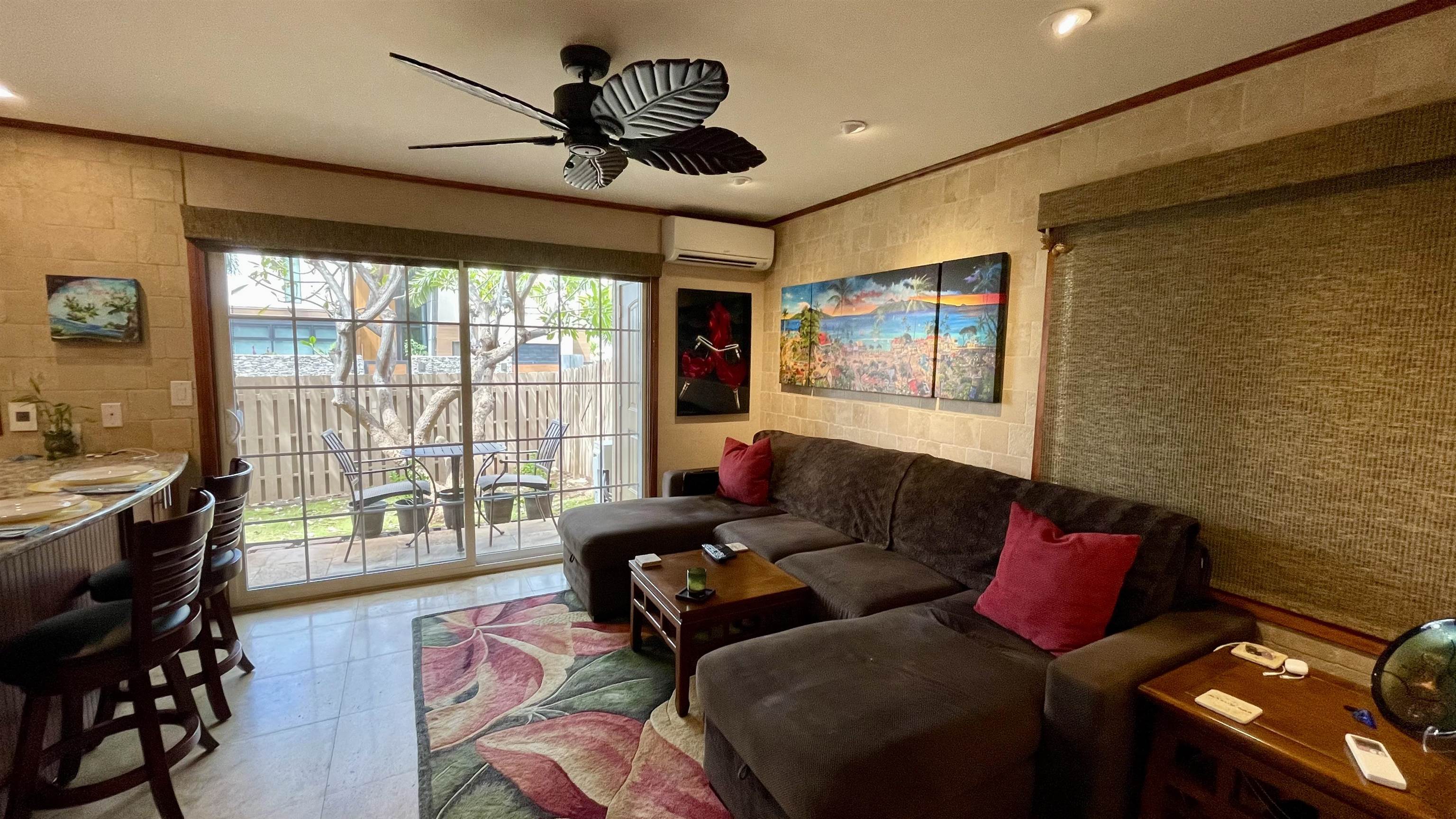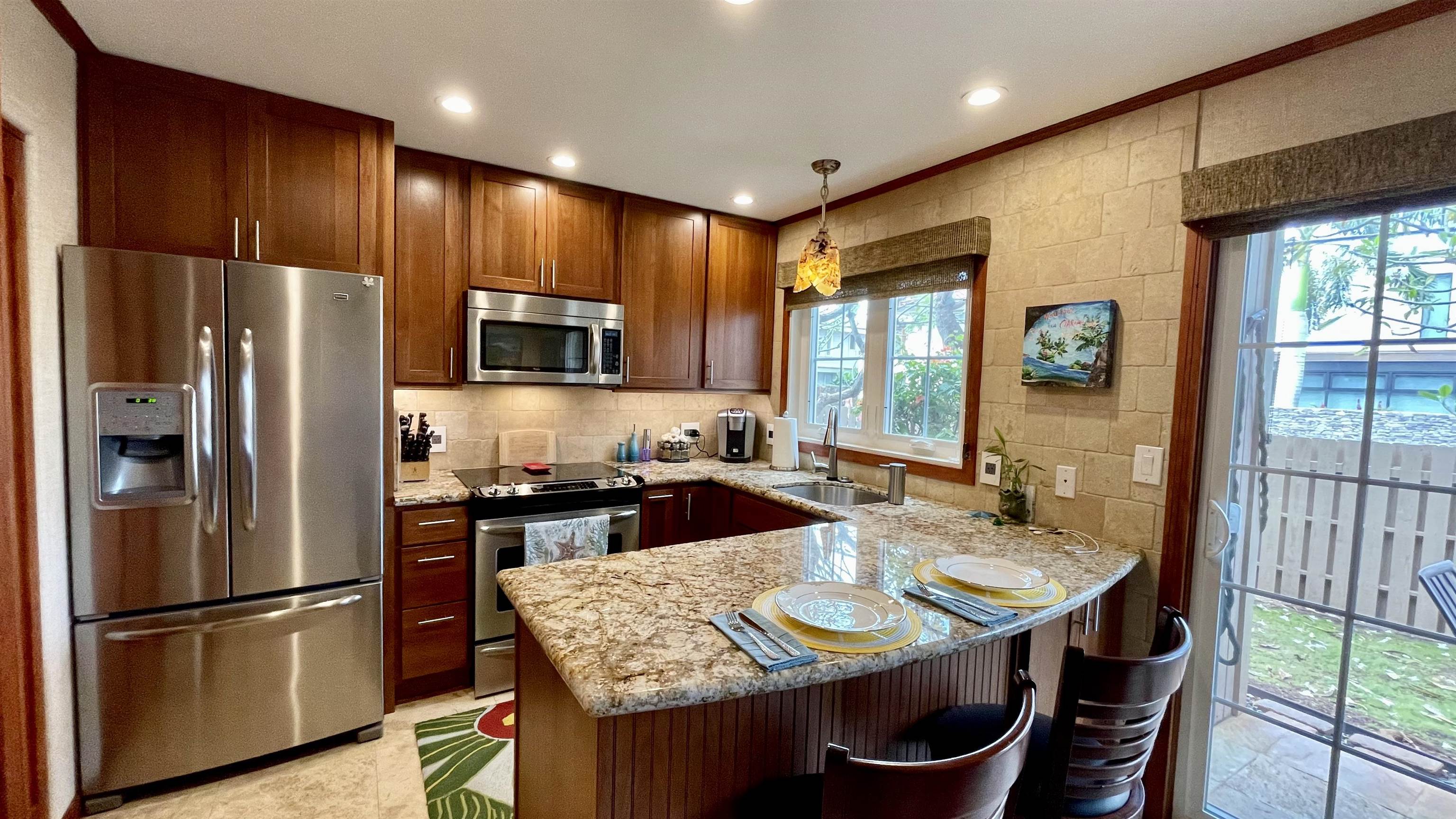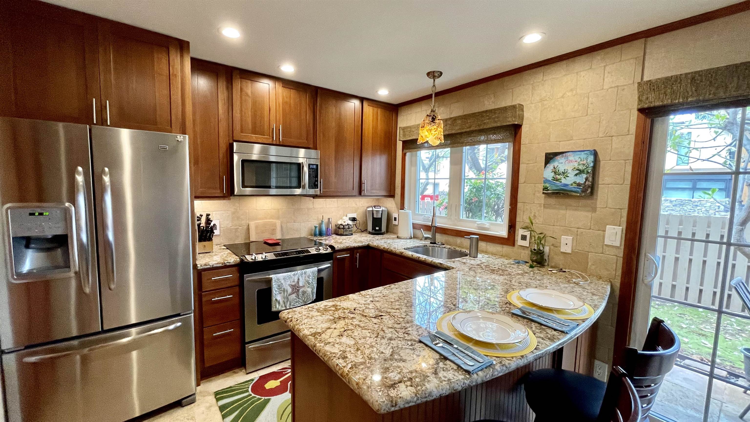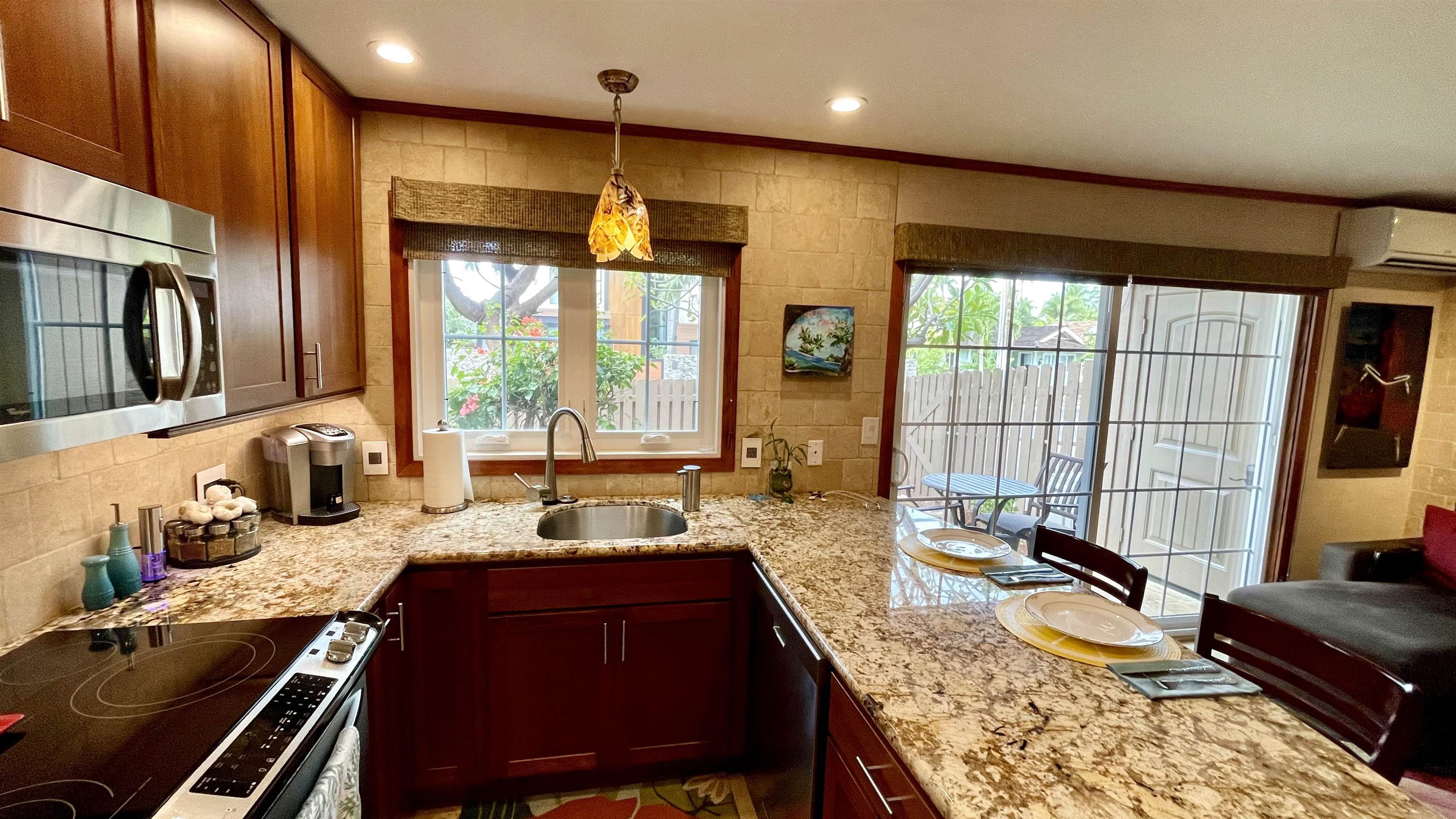 Stunning renovation in this condo located at Lahaina Residential, short distance to Baby Beach, shops, restaurants, bars and town. High end renovation includes granite counters, travertine floors, custom shower, Hawaiian style-stained crown molding and base to match, Plantation style louver doors, upgraded wallpaper, vessel glass sink in the bathroom, touch on kitchen faucet, high end appliances, 3-year-old Mitsubishi split AC, partial ocean view, desired end unit in front building, and a dedicated Tesla and electric car outlet next to parking stall. This is a one-of-a kind unit in this complex and is a must see. The remodel is top of the line. Comes mostly furnished with dishes, pots and pans and furniture (artwork on walls not included). Short Term Rentals NOT Allowed, but we are getting great market rent!