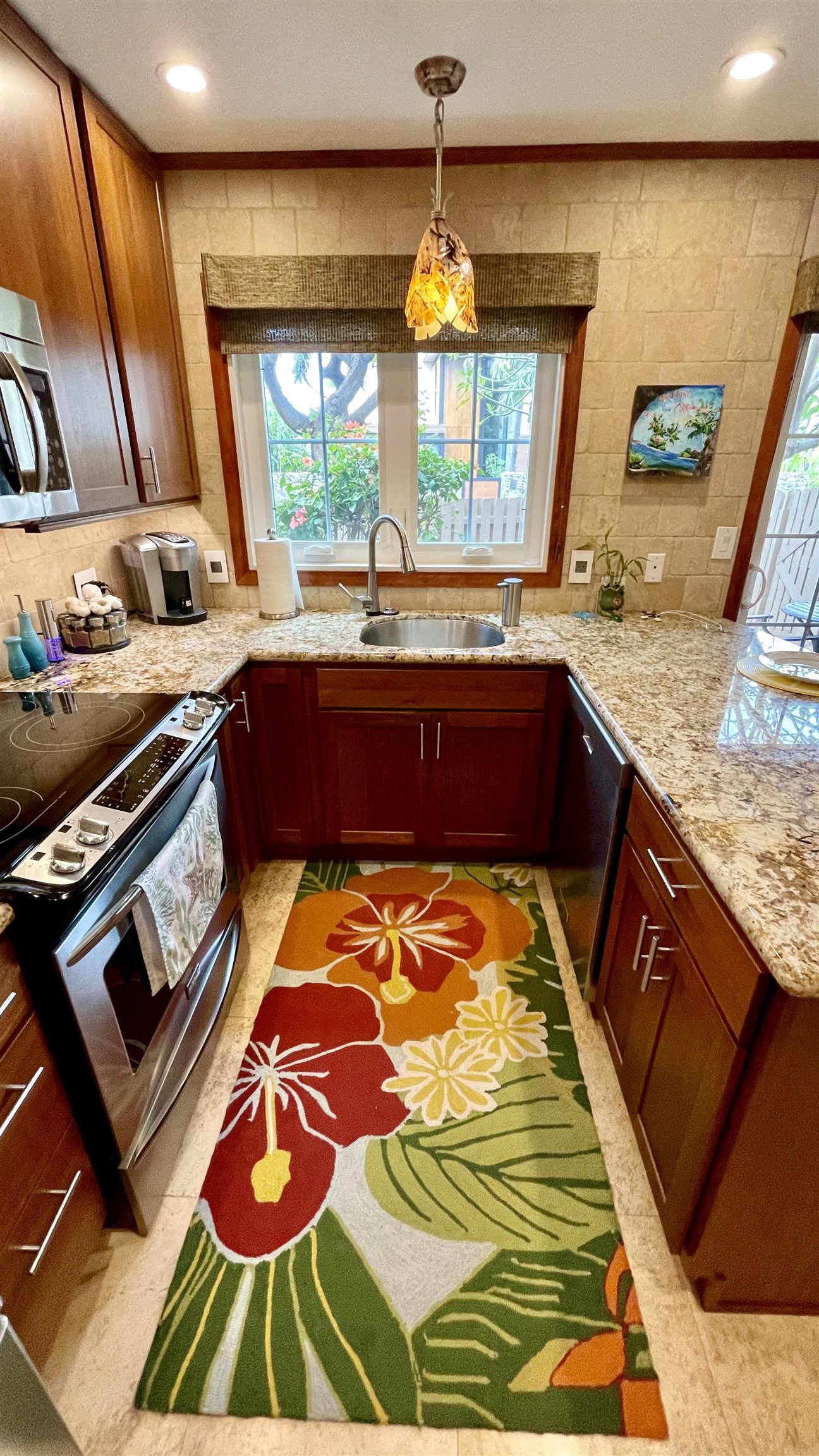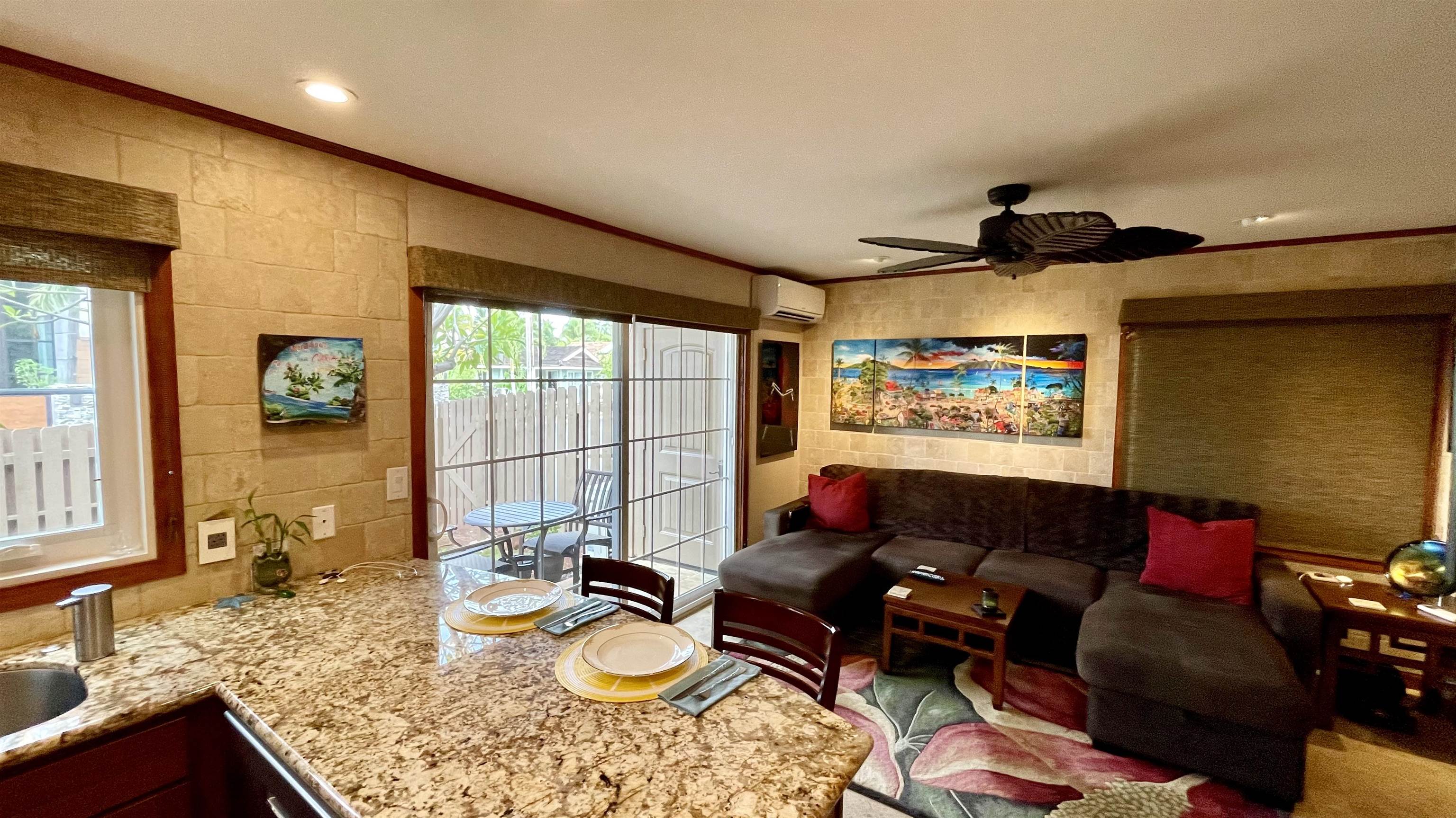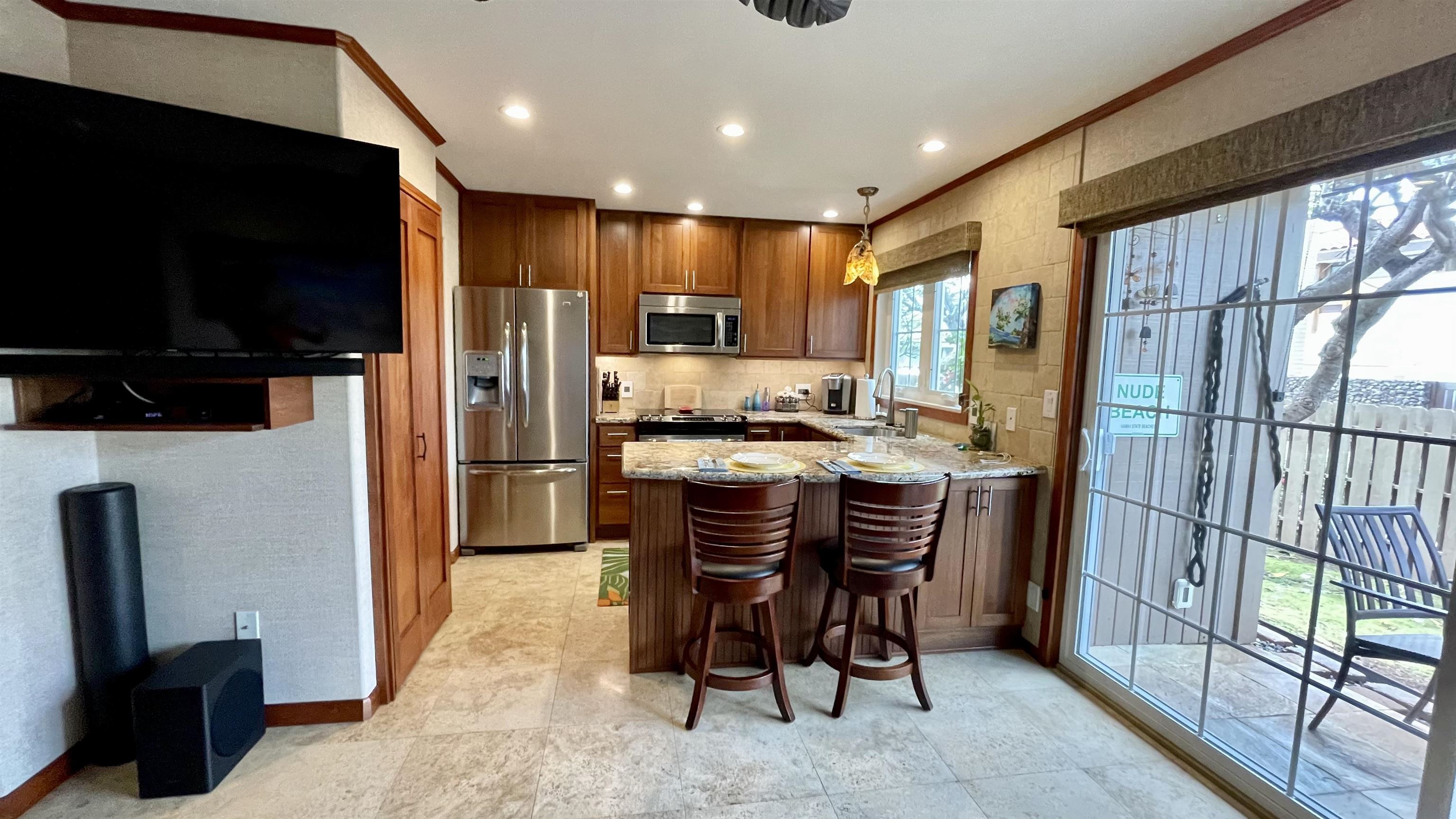 Stunning renovation in this condo located at Lahaina Residential, short distance to Baby Beach, shops, restaurants, bars and town. High end renovation includes granite counters, travertine floors, custom shower, Hawaiian style-stained crown molding and base to match, Plantation style louver doors, upgraded wallpaper, vessel glass sink in the bathroom, touch on kitchen faucet, high end appliances, 3-year-old Mitsubishi split AC, partial ocean view, desired end unit in front building, and a dedicated Tesla and electric car outlet next to parking stall. This is a one-of-a kind unit in this complex and is a must see. The remodel is top of the line. Comes mostly furnished with dishes, pots and pans and furniture (artwork on walls not included). Short Term Rentals NOT Allowed, but we are getting great market rent!