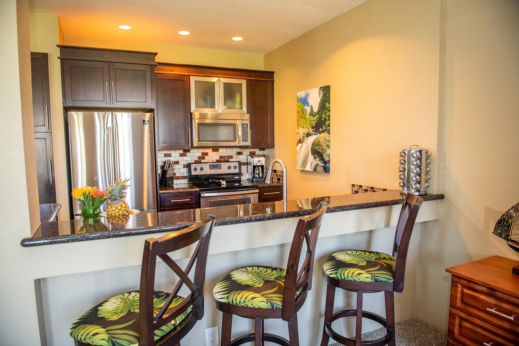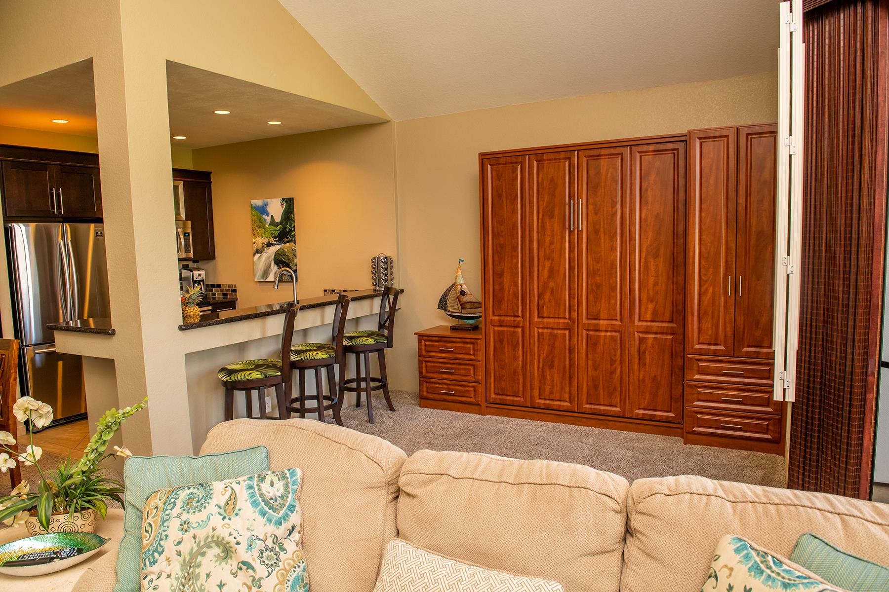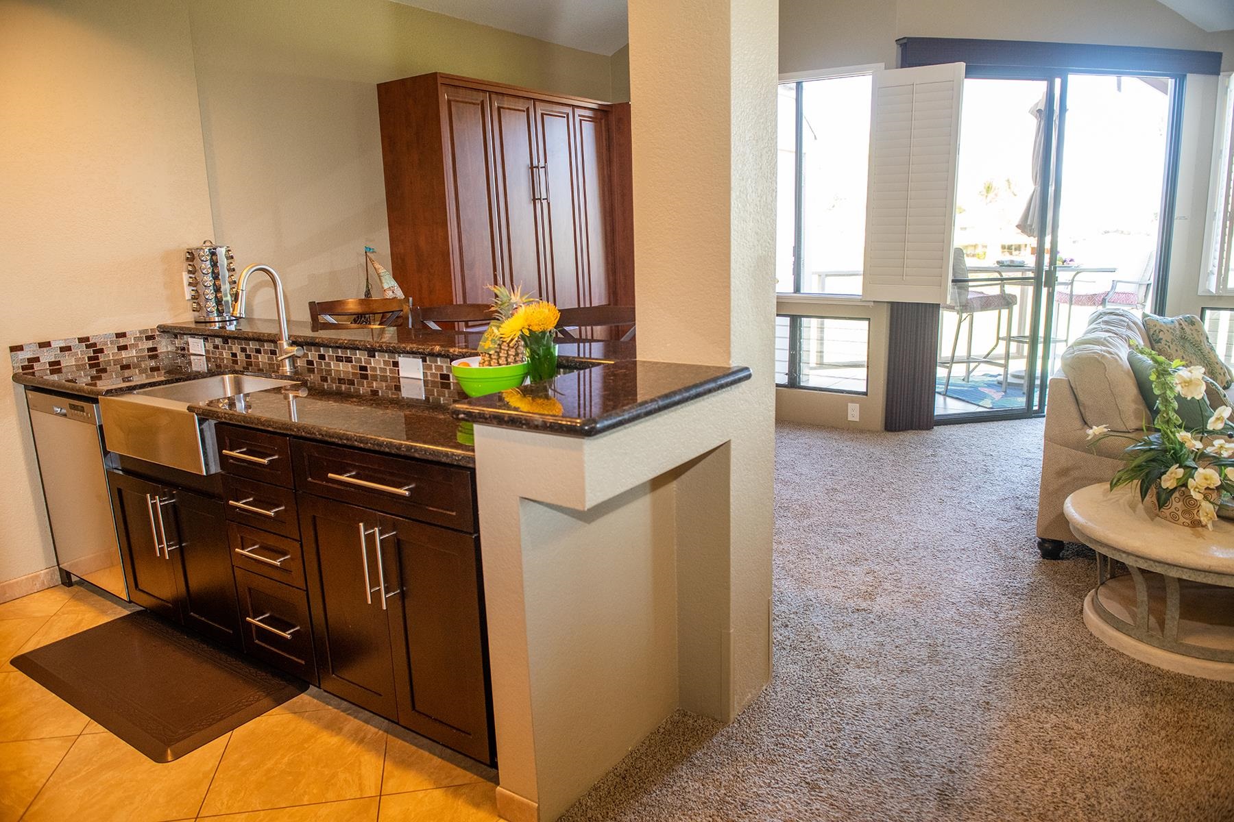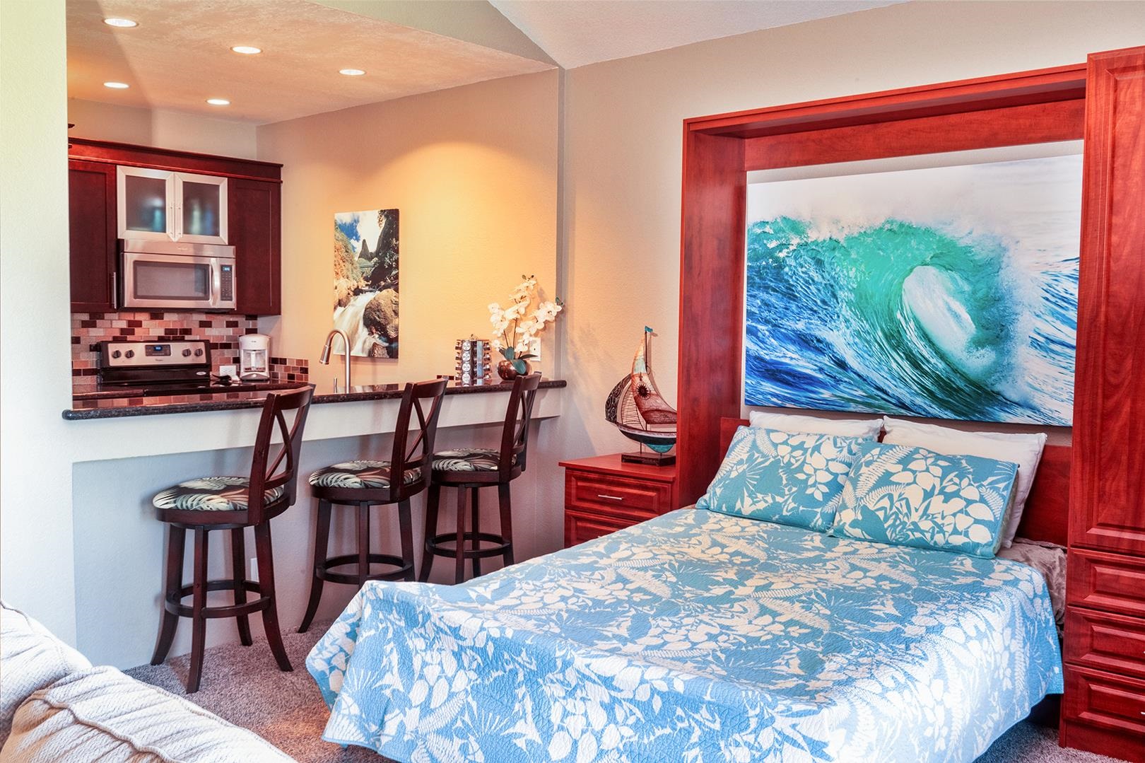 Grand Champions 172 offers a rare opportunity to acquire a top floor, vaulted ceiling, designer one bedroom condo with sweeping golf course and ocean views. Step in to this thoughtfully designed condo and feel immediately at home.Wrapped by, and overlooking the Wailea Blue course, this villa provides prime ocean with golf course views, in the heart of Wailea. A beautiful one bedroom two bath 908 sq. ft. unit includes a high-quality remodel, complete with vaulted ceilings and an abundance of natural light. Upgrades include granite countertops, newer stainless steel appliances, soft close cabinetry, custom designed glass, and a designed Murphy bed (with a full sized Queen mattress) to let your one bedroom live like a two bedroom. Just a short stroll away are prime dining, and shopping options, not to mention some of Maui's most beautiful beaches. Grand Champions has two pool areas to maximize a peaceful atmosphere as well as bbq areas. Make this comfortable condo your primary residence in Wailea and experience the joy of island life. It's more than just a home, it's a personal sanctuary in paradise. Call your favorite Realtor to secure this great Wailea property.